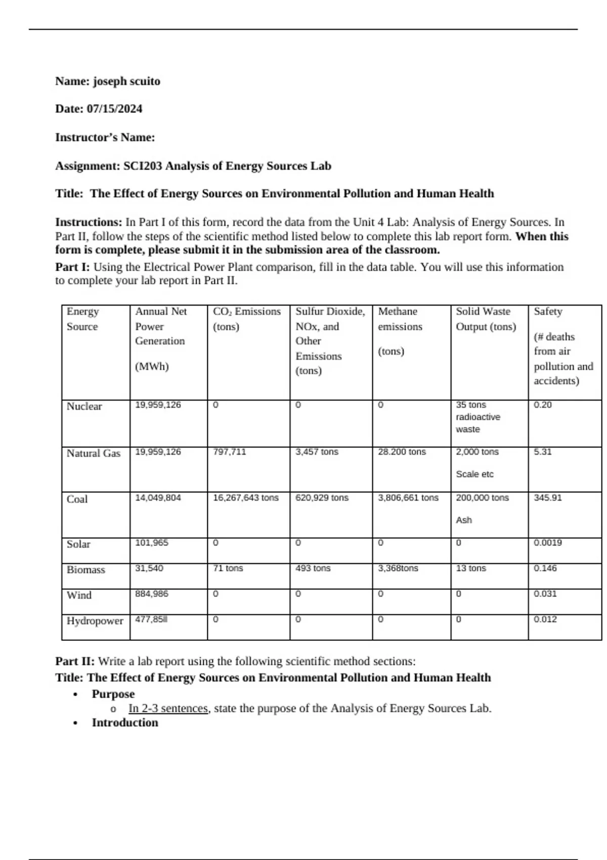 Assignment: SCI203 Analysis of Energy Sources Lab
