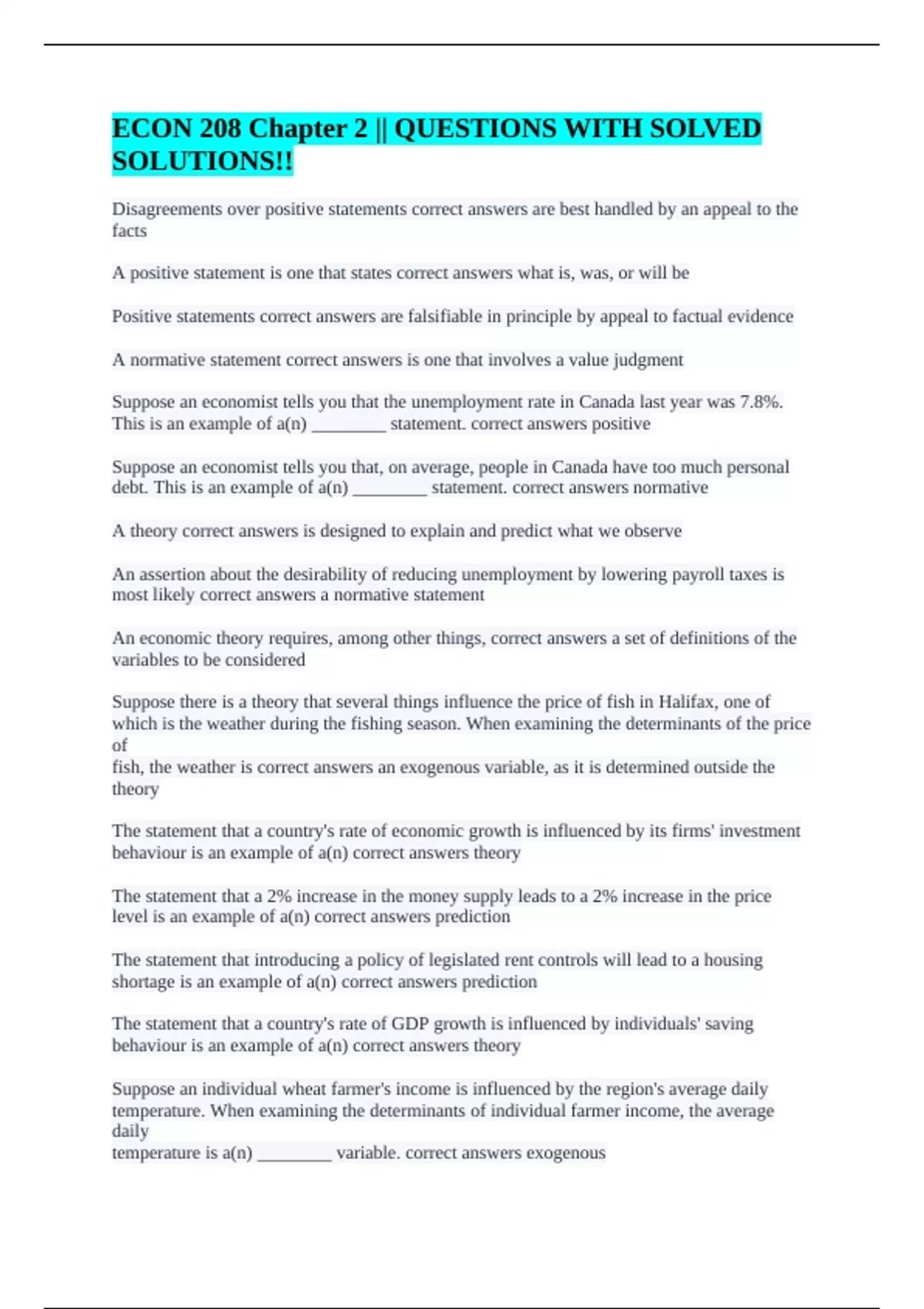 Disagreements over positive statements correct answers are best handled by an appeal to the facts A positive statement is one that states correct answers what is, was, or will be Positive statements correct answers are falsifiable in principle by appeal to factual evidence A normative statement correct answers is one that involves a value judgment Suppose an economist tells you that the unemployment rate in Canada last year was 7.8%. This is an example of a(n) ________ statement. correct answers positive Suppose an economist tells you that, on average, people in Canada have too much personal debt. This is an example of a(n) ________ statement. correct answers normative A theory correct answers is designed to explain and predict what we observe An assertion about the desirability of reducing unemployment by lowering payroll taxes is most likely correct answers a normative statement An economic theory requires, among other things, correct answers a set of definitions of the variables to be considered Suppose there is a theory that several things influence the price of fish in Halifax, one of which is the weather during the fishing season. When examining the determinants of the price of fish, the weather is correct answers an exogenous variable, as it is determined outside the theory The statement that a country's rate of economic growth is influenced by its firms' investment behaviour is an example of a(n) correct answers theory The statement that a 2% increase in the money supply leads to a 2% increase in the price level is an example of a(n) correct answers prediction The statement that introducing a policy of legislated rent controls will lead to a housing shortage is an example of a(n) correct answers prediction The statement that a country's rate of GDP growth is influenced by individuals' saving behaviour is an example of a(n) correct answers theory Suppose an individual wheat farmer's income is influenced by the region's average daily temperature. When examining the determinants of individual farmer income, the average daily temperature is a(n) ________ variable. correct answers exogenous