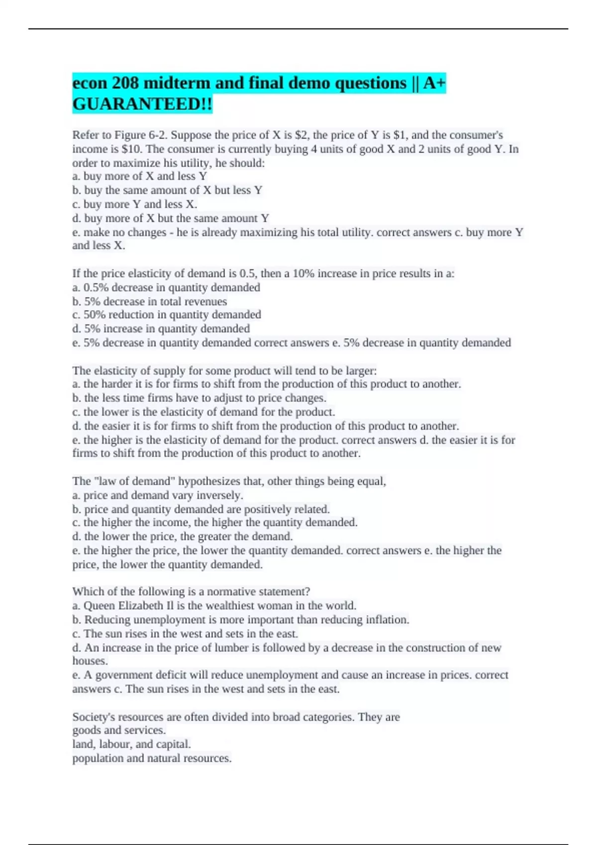 e. make no changes - he is already maximizing his total utility. correct answers c. buy more Y