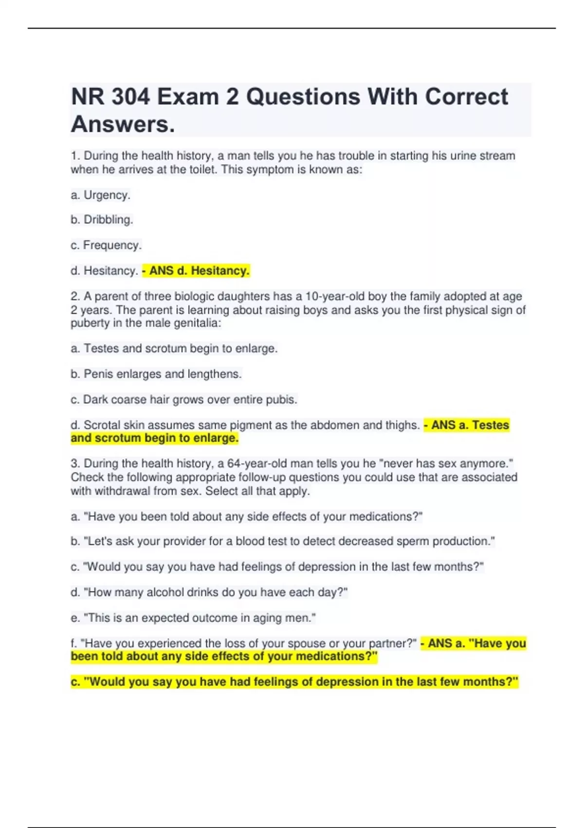 NR 304 Exam 2 Questions With Correct Answers. 1. During the health history, a man tells you he has trouble in starting his urine stream when he arrives at the toilet. This symptom is known as: a. Urgency. b. Dribbling. c. Frequency. d. Hesitancy. - ANS d. Hesitancy. 2. A parent of three biologic daughters has a 10-year-old boy the family adopted at age 2 years. The parent is learning about raising boys and asks you the first physical sign of puberty in the male genitalia: a. Testes and scrotum begin to enlarge. b. Penis enlarges and lengthens. c. Dark coarse hair grows over entire pubis. d. Scrotal skin assumes same pigment as the abdomen and thighs. - ANS a. Testes and scrotum begin to enlarge. 3. During the health history, a 64-year-old man tells you he "never has sex anymore." Check the following appropriate follow-up questions you could use that are associated with withdrawal from sex. Select all that apply. a. "Have you been told about any side effects of your medications?" b. "Let's ask your provider for a blood test to detect decreased sperm production." c. "Would you say you have had feelings of depression in the last few months?" d. "How many alcohol drinks do you have each day?" e. "This is an expected outcome in aging men." f. "Have you experienced the loss of your spouse or your partner?" - ANS a. "Have you been told about any side effects of your medications?" c. "Would you say you have had feelings of depression in the last few months?" d. "How many alcohol drinks do you have each day?" f. "Have you experienced the loss of your spouse or your partner?" 4. A mother and father in the 7th month of their first pregnancy ask you about the benefits of circumcising their expected baby boy. Check all the facts you can share to help them with their decision. a. In the United States, circumcising baby boys is a proven way to prevent HIV transmission later in life. b. Removal of the foreskin decreases the incidence of urinary tract infections in very young infants. c. Most surgical risks of infant circumcision are minor and treatable. d. In the United States, circumcision protects against acquiring human papillomavirus and syphilis later in life. - ANS b. Removal of the foreskin decreases the incidence of urinary tract infections in very young infants. c. Most surgical risks of infant circumcision are minor and treatable. 5. You perform a genital examination on a 48-year-old man and note deeply pigmented wrinkled scrotal skin, with multiple, yellowish, 1-cm, firm, nontender nodules. What would be your next most appropriate action? a. Ask about any family history of testicular cancer in the father or brothers. b. Consider these sebaceous follicles an expected finding and proceed with the examination. c. Assess the scrotum using transillumination. d. Obtain a detailed history focusing on any scrotal abnormalities the man has noticed. - ANS b. Consider these sebaceous follicles an expected finding and proceed with the examination. 6. You perform a genital examination on a 25-year-old man and palpate testes that feel ovoid and movable yet somewhat sensitive to compression. What is your next most