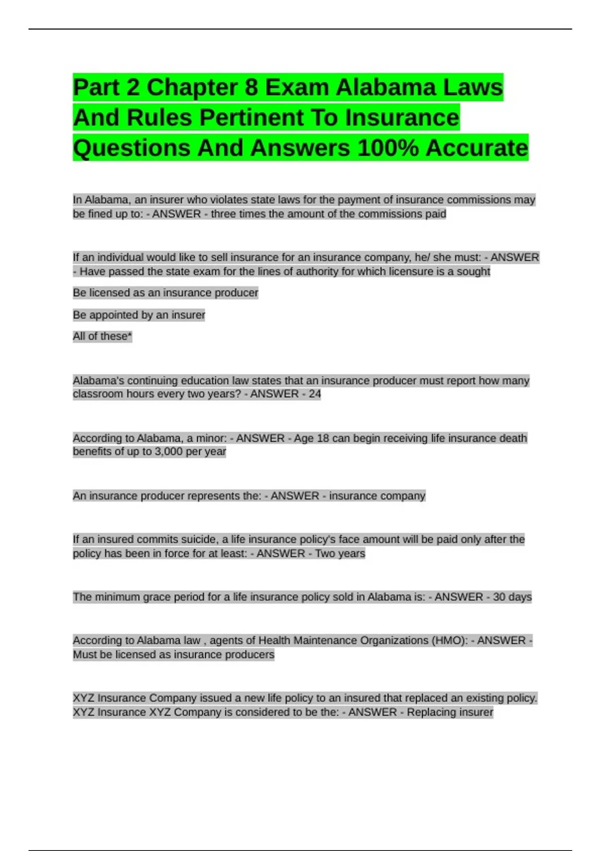 The minimum grace period for a life insurance policy sold in Alabama is: - ANSWER - 30 days