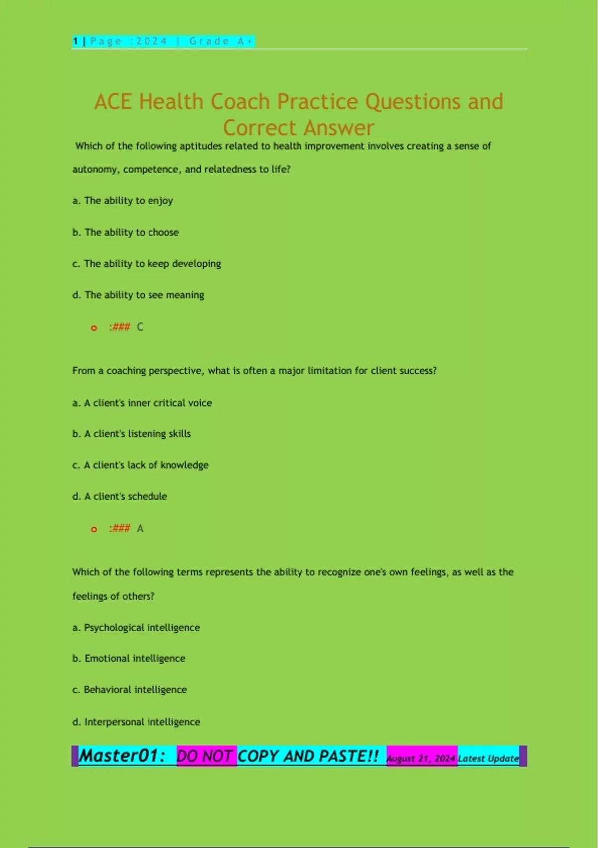 Which of the following aptitudes related to health improvement involves creating a sense of autonomy, competence, and relatedness to life? a. The ability to enjoy b. The ability to choose c. The ability to keep developing d. The ability to see meaning o :### C From a coaching perspective, what is often a major limitation for client success? a. A client's inner critical voice b. A client's listening skills c. A client's lack of knowledge d. A client's schedule o :### A Which of the following terms represents the ability to recognize one's own feelings, as well as the feelings of others? a. Psychological intelligence b. Emotional intelligence c. Behavioral intelligence d. Interpersonal intelligence 2 | P a g e : 2 0 2 4 | G r a d e A + Master01: DO NOT COPY AND PASTE!! August 21, 2024 Latest Update o :### B Which of the following components of emotional intelligence involves understanding the emotions, needs, and concerns of others? a. Self-awareness b. Self-regulation c. Empathy d. Social skills o :###