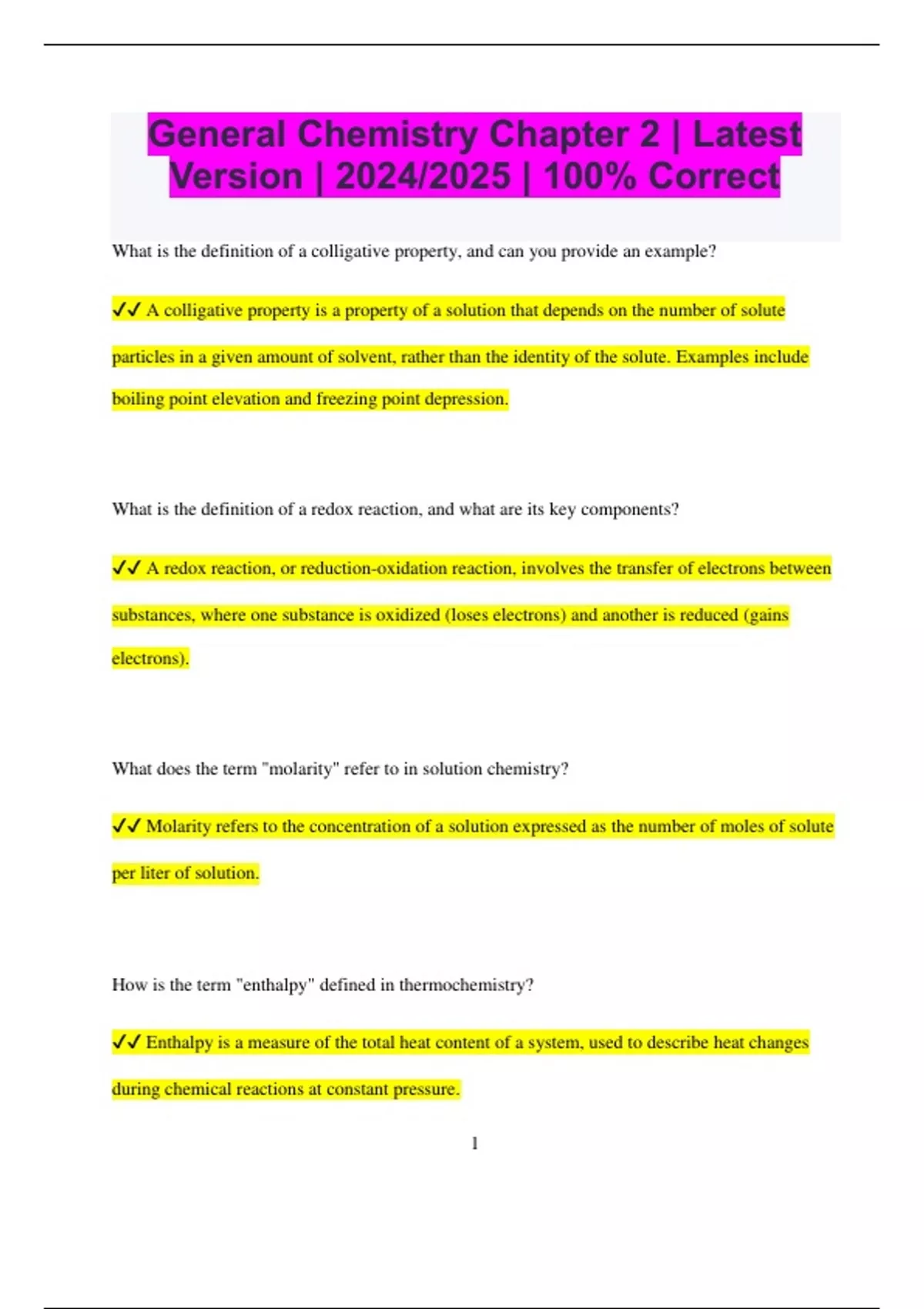 General Chemistry Chapter 2 | Latest Version | 2024/2025 | 100% Correct What is the definition of a colligative property, and can you provide an example? A colligative property is a property of a solution that depends on the number of solute particles in a given amount of solvent, rather than the identity of the solute. Examples include boiling point elevation and freezing point depression. What is the definition of a redox reaction, and what are its key components? A redox reaction, or reduction-oxidation reaction, involves the transfer of electrons between substances, where one substance is oxidized (loses electrons) and another is reduced (gains electrons). What does the term "molarity" refer to in solution chemistry? Molarity refers to the concentration of a solution expressed as the number of moles of solute per liter of solution. How is the term "enthalpy" defined in thermochemistry? Enthalpy is a measure of the total heat content of a system, used to describe heat changes during chemical reactions at constant pressure. 2 What is the definition of a buffer solution, and how does it function in maintaining pH? A buffer solution is a solution that resists changes in pH upon the addition of small amounts of an acid or a base, due to the presence of a weak acid and its conjugate base or a weak base and its conjugate acid. What is the definition of a coordination compound, and what are its essential components? A coordination compound consists of a central metal atom or ion bonded to a set of surrounding ligands, which are molecules or ions that donate electron pairs to the metal. What does "activation energy" mean in the context of chemical reactions? Activation energy is the minimum energy required for reactants to transform into products during a chemical reaction. What is the definition of an isotonic solution, and why is it important in biological systems? An isotonic solution has the same osmotic pressure as the fluid inside a cell, preventing net movement of water into or out of the cell, which is crucial for maintaining cell shape and function. 3 How is the term "stoichiometry" defined in relation to chemical reactions? Stoichiometry is the branch of chemistry that deals with the calculation of reactants and products in chemical reactions based