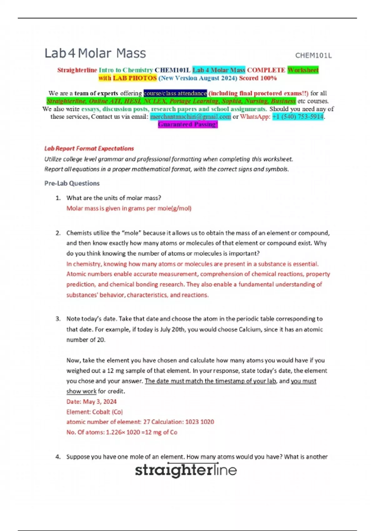 Straighterline Intro to Chemistry CHEM101L Lab 4 Molar Mass COMPLETE Worksheet with LAB PHOTOS (New Version August 2024) Scored 100%