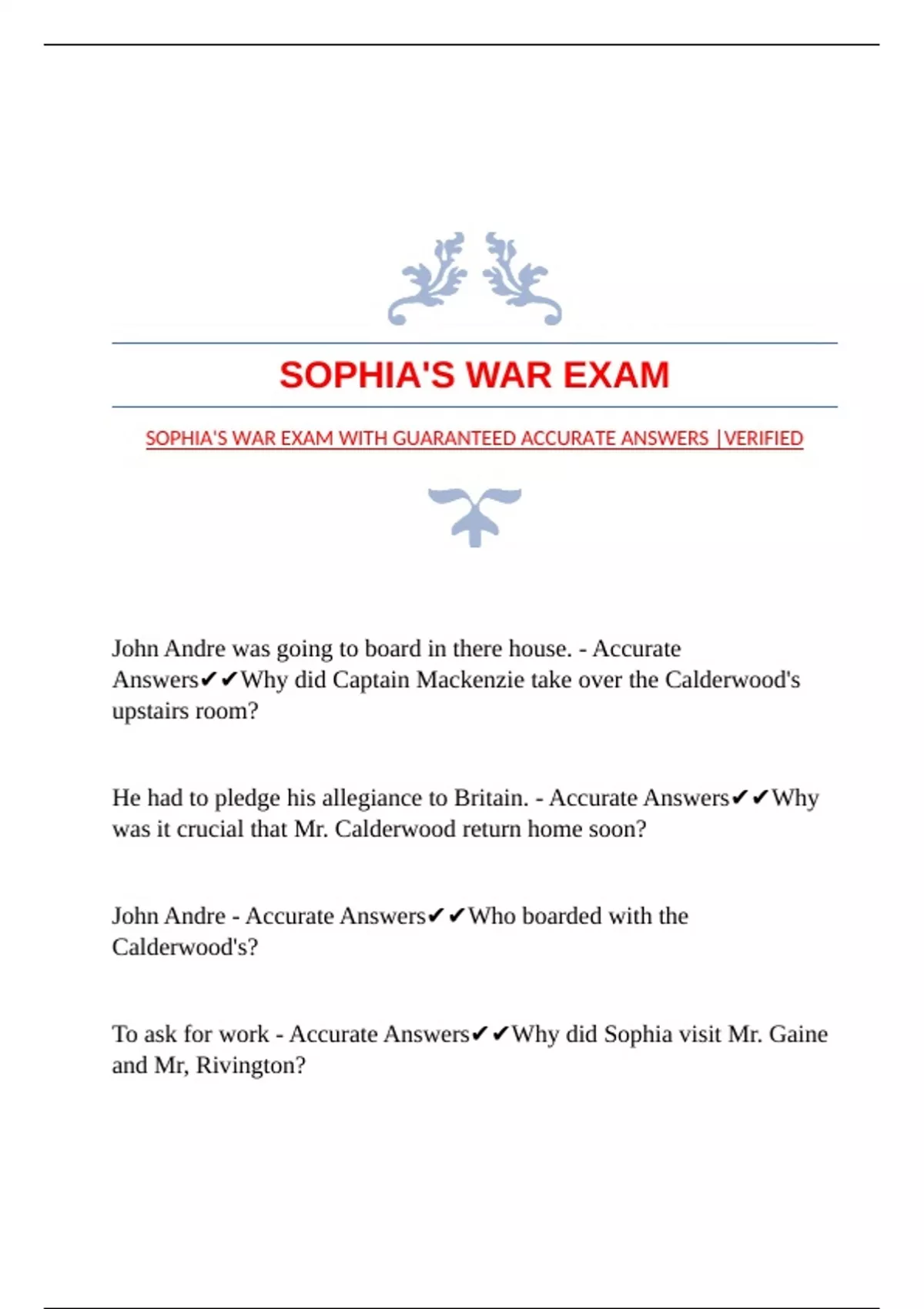 SOPHIA'S WAR EXAM WITH GUARANTEED ACCURATE ANSWERS |VERIFIED