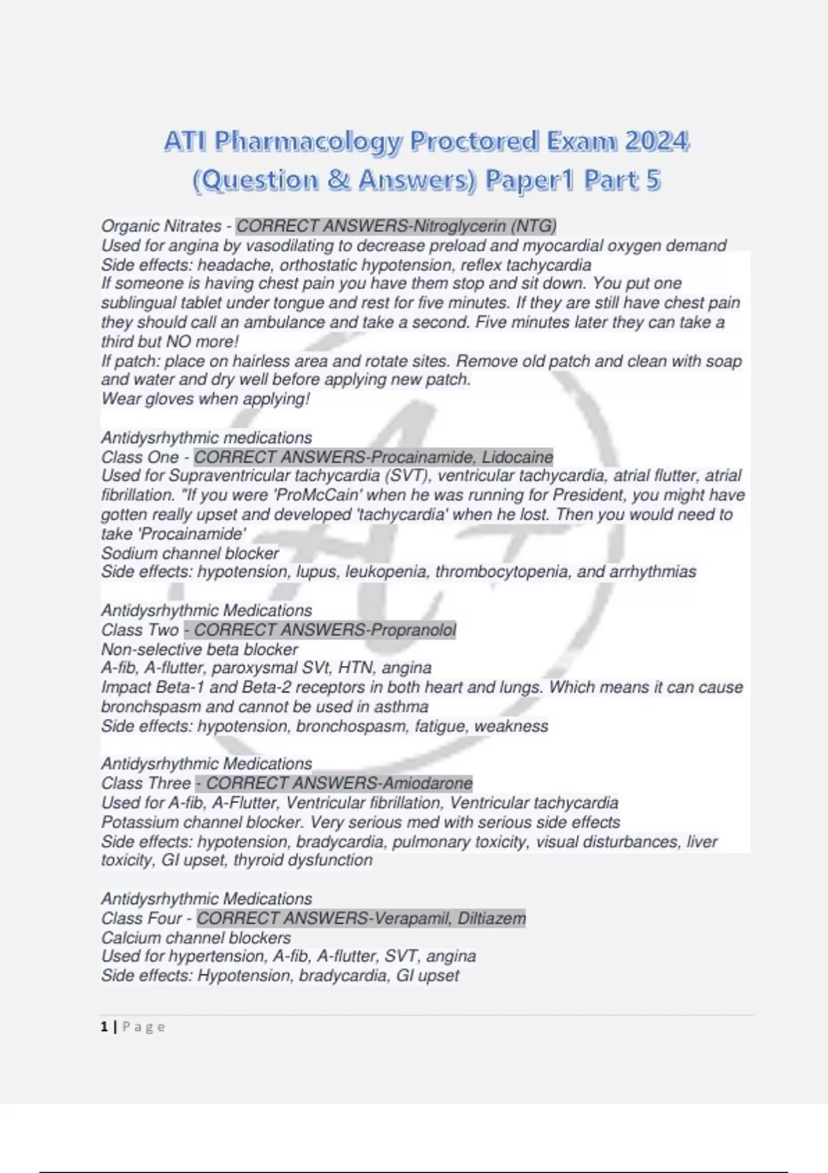 Organic Nitrates - CORRECT ANSWERS-Nitroglycerin (NTG) Used for angina by vasodilating to decrease preload and myocardial oxygen demand Side effects: headache, orthostatic hypotension, reflex tachycardia If someone is having chest pain you have them stop and sit down. You put one sublingual tablet under tongue and rest for five minutes. If they are still have chest pain they should call an ambulance and take a second. Five minutes later they can take a third but NO more! If patch: place on hairless area and rotate sites. Remove old patch and clean with soap and water and dry well before applying new patch. Wear gloves when applying! Antidysrhythmic medications Class One - CORRECT ANSWERS-Procainamide, Lidocaine Used for Supraventricular tachycardia (SVT), ventricular tachycardia, atrial flutter, atrial fibrillation. "If you were 'ProMcCain' when he was running for President, you might have gotten really upset and developed 'tachycardia' when he lost. Then you would need to take 'Procainamide' Sodium channel blocker Side effects: hypotension, lupus, leukopenia, thrombocytopenia, and arrhythmias Antidysrhythmic Medications Class Two - CORRECT ANSWERS-Propranolol Non-selective beta blocker A-fib, A-flutter, paroxysmal SVt, HTN, angina Impact Beta-1 and Beta-2 receptors in both heart and lungs. Which means it can cause bronchspasm and cannot be used in asthma Side effects: hypotension, bronchospasm, fatigue, weakness Antidysrhythmic Medications Class Three - CORRECT ANSWERS-Amiodarone Used for A-fib, A-Flutter, Ventricular fibrillation, Ventricular tachycardia Potassium channel blocker. Very serious med with serious side effects Side effects: hypotension, bradycardia, pulmonary toxicity, visual disturbances, liver toxicity, GI upset, thyroid dysfunction Antidysrhythmic Medications Class Four - CORRECT ANSWERS-Verapamil, Diltiazem Calcium channel blockers Used for hypertension, A-fib, A-flutter, SVT, angina Side effects: Hypotension, bradycardia, GI upset HMG-CoA Reductase Inhibitors - CORRECT ANSWERS-(Statins) Atorvastatin Lowers cholesterol and decreases risk of MI by increasing HDL and decreasing LDL. Side effects: Hepatotoxicity, Muscle pain, GI upset, Rhabdomyolysis Administer in the evening with a meal because cholesterol is synthesized at night Monitor liver function and CK labs Patient should avoid alcohol Cholesterol Absorption Inhibitors - CORRECT ANSWERS-Ezetimibe Lowers cholesterol by inhibiting absorption in small intestine "eZetimibe causes cholesterol to Zip on through" Side effects: hepatotoxicity and muscle pain Monitor liver function and CK levels Bile-acid Sequestrants - CORRECT ANSWERS-Colesevelam, Colestipol Used to lower cholesterol by binding bile acids in intestine which causes more cholesterol to be pulled from the blood stream to be used for new bile Side effects: constipation! Take with food and full glass of water Can interfere with absorption of fat soluble vitamins (DEKA) and oral contraceptives