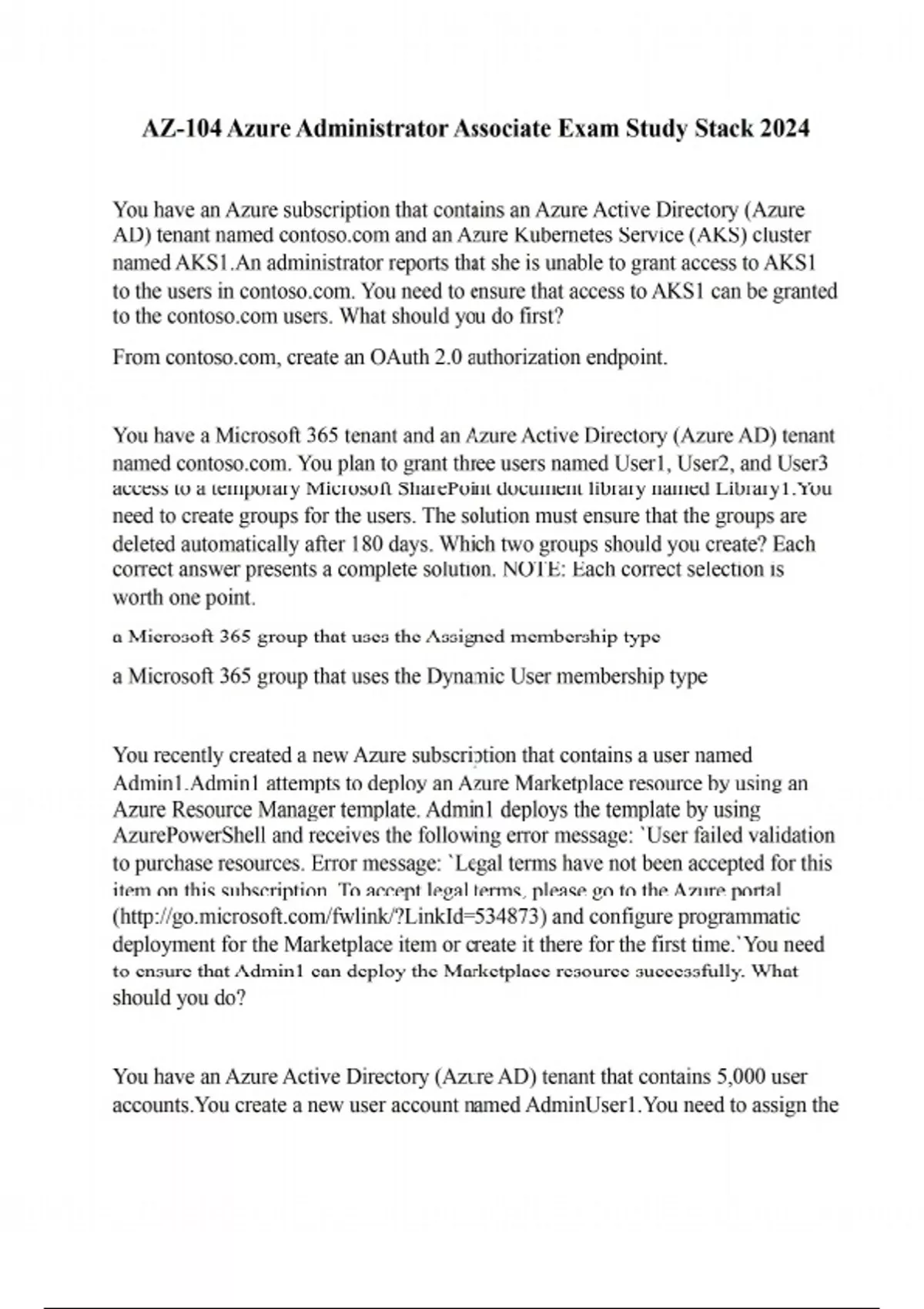 You have an Azure subscription that contains an Azure Active Directory (Azure AD) tenant named and an Azure Kubernetes Service (AKS) cluster named AKS1.An administrator reports that she is unable to grant access to AKS1 to the users in . You need to ensure that access to AKS1 can be granted to the users. What should you do first? From , create an OAuth 2.0 authorization endpoint. You have a Microsoft 365 tenant and an Azure Active Directory (Azure AD) tenant named . You plan to grant three users named User1, User2, and User3 access to a temporary Microsoft SharePoint document library named Library1.You need to create groups for the users. The solution must ensure that the groups are deleted automatically after 180 days. Which two groups should you create? Each correct answer presents a complete solution. NOTE: Each correct selection is worth one point. a Microsoft 365 group that uses the Assigned membership type a Microsoft 365 group that uses the Dynamic User membership type You recently created a new Azure subscription that contains a user named Admin1.Admin1 attempts to deploy an Azure Marketplace resource by using an Azure Resource Manager template. Admin1 deploys the template by using AzurePowerShell and receives the following error message: `User failed validation to purchase resources. Error message: `Legal terms have not been accepted for this item on this subscription. To accept legal terms, please go to the Azure portal ( deployment for the Marketplace item or create it there for the first time.`You need to ensure that Admin1 can deploy the Marketplace resource successfully. What should you do?