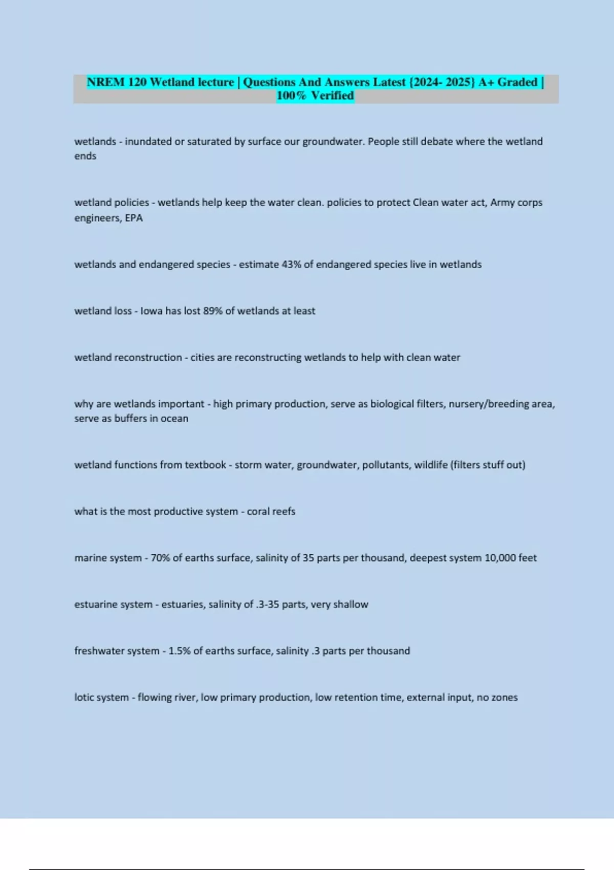 NREM 120 Wetland lecture | Questions And Answers Latest {2024- 2025} A+ Graded |