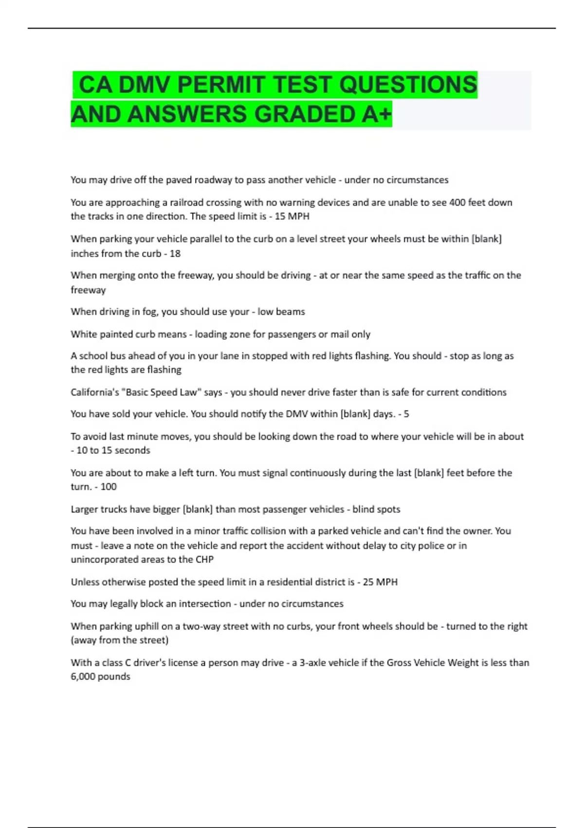 CA DMV PERMIT TEST QUESTIONS