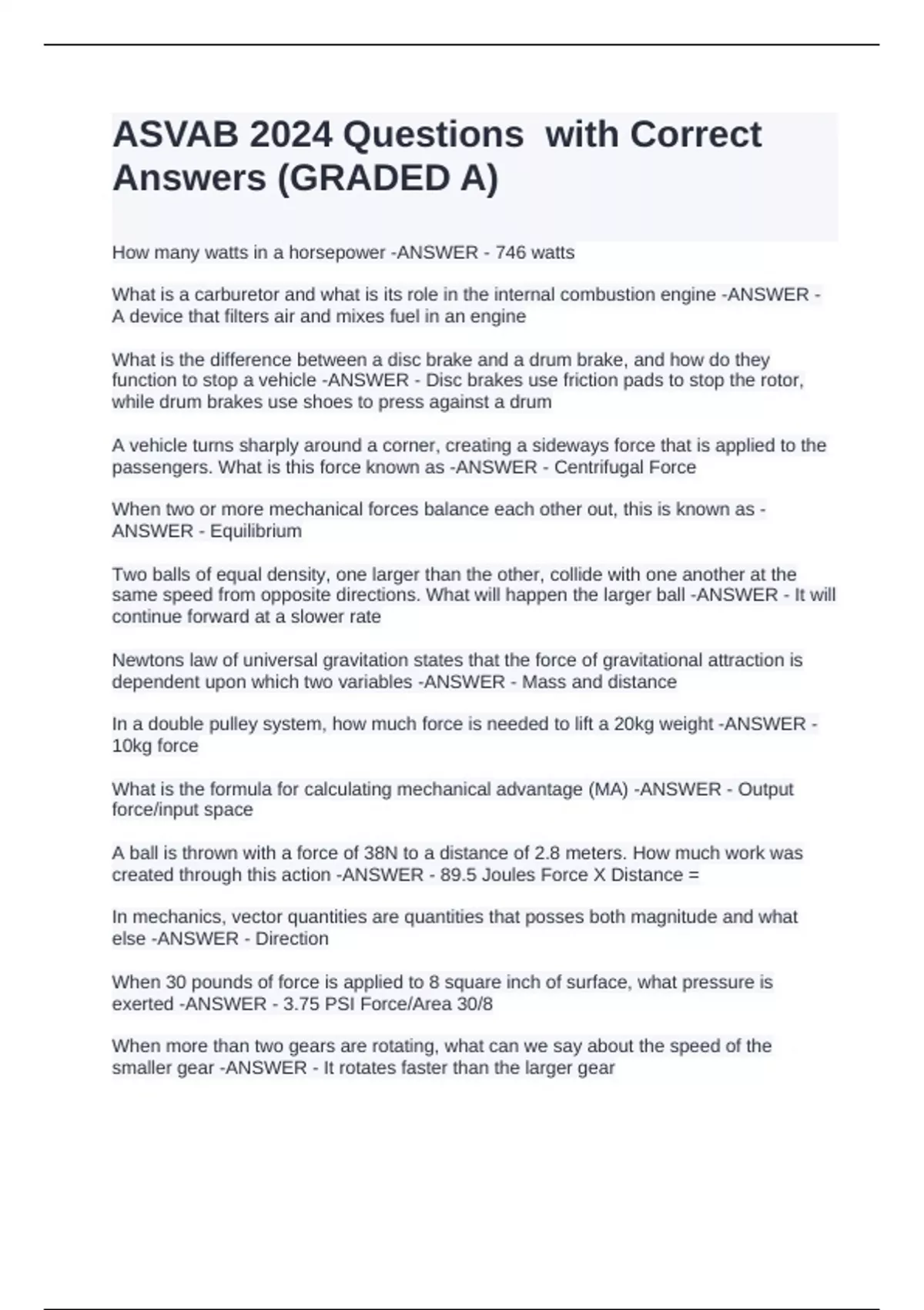 How many watts in a horsepower -ANSWER - 746 watts What is a carburetor and what is its role in the internal combustion engine -ANSWER - A device that filters air and mixes fuel in an engine What is the difference between a disc brake and a drum brake, and how do they function to stop a vehicle -ANSWER - Disc brakes use friction pads to stop the rotor, while drum brakes use shoes to press against a drum A vehicle turns sharply around a corner, creating a sideways force that is applied to the passengers. What is this force known as -ANSWER - Centrifugal Force When two or more mechanical forces balance each other out, this is known as -ANSWER - Equilibrium Two balls of equal density, one larger than the other, collide with one another at the same speed from opposite directions. What will happen the larger ball -ANSWER - It will continue forward at a slower rate Newtons law of universal gravitation states that the force of gravitational attraction is dependent upon which two variables -ANSWER - Mass and distance In a double pulley system, how much force is needed to lift a 20kg weight -ANSWER - 10kg force What is the formula for calculating mechanical advantage (MA) -ANSWER - Output force/input space A ball is thrown with a force of 38N to a distance of 2.8 meters. How much work was created through this action -ANSWER - 89.5 Joules Force X Distance = In mechanics, vector quantities are quantities that posses both magnitude and what else -ANSWER - Direction When 30 pounds of force is applied to 8 square inch of surface, what pressure is exerted -ANSWER - 3.75 PSI Force/Area 30/8 When more than two gears are rotating, what can we say about the speed of the smaller gear -ANSWER - It rotates faster than the larger gear What are Registers -ANSWE
