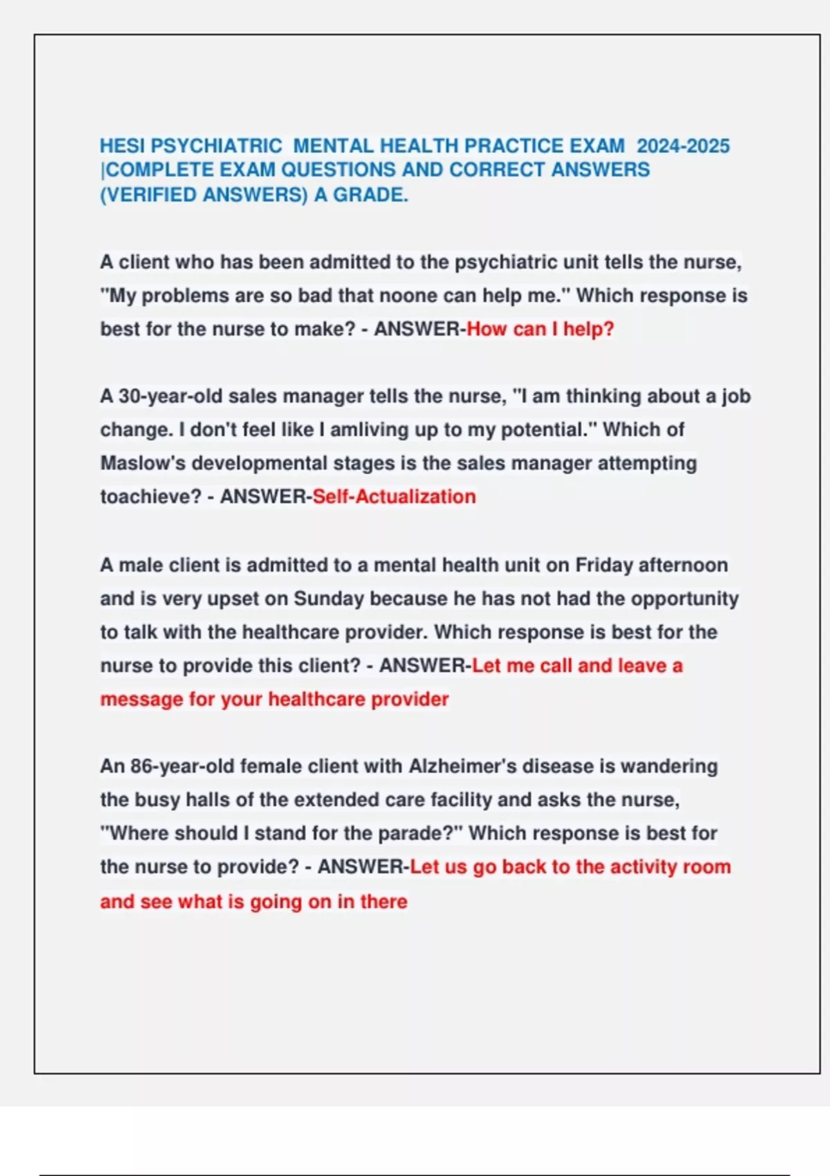 the nurse to provide? - ANSWER-Let us go back to the activity room