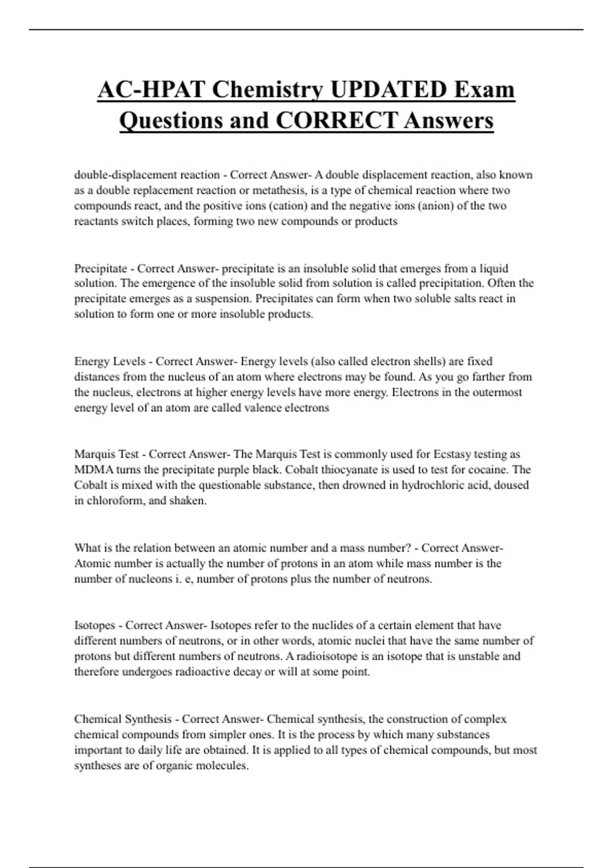 AC-HPAT Chemistry UPDATED Exam Questions and CORRECT Answers double-displacement reaction - Correct Answer- A double displacement reaction, also known as a double replacement reaction or metathesis, is a type of chemical reaction where two compounds react, and the positive ions (cation) and the negative ions (anion) of the two reactants switch places, forming two new compounds or products Precipitate - Correct Answer- precipitate is an insoluble solid that emerges from a liquid solution. The emergence of the insoluble solid from solution is called precipitation. Often the precipitate emerges as a suspension. Precipitates can form when two soluble salts react in solution to form one or more insoluble products.