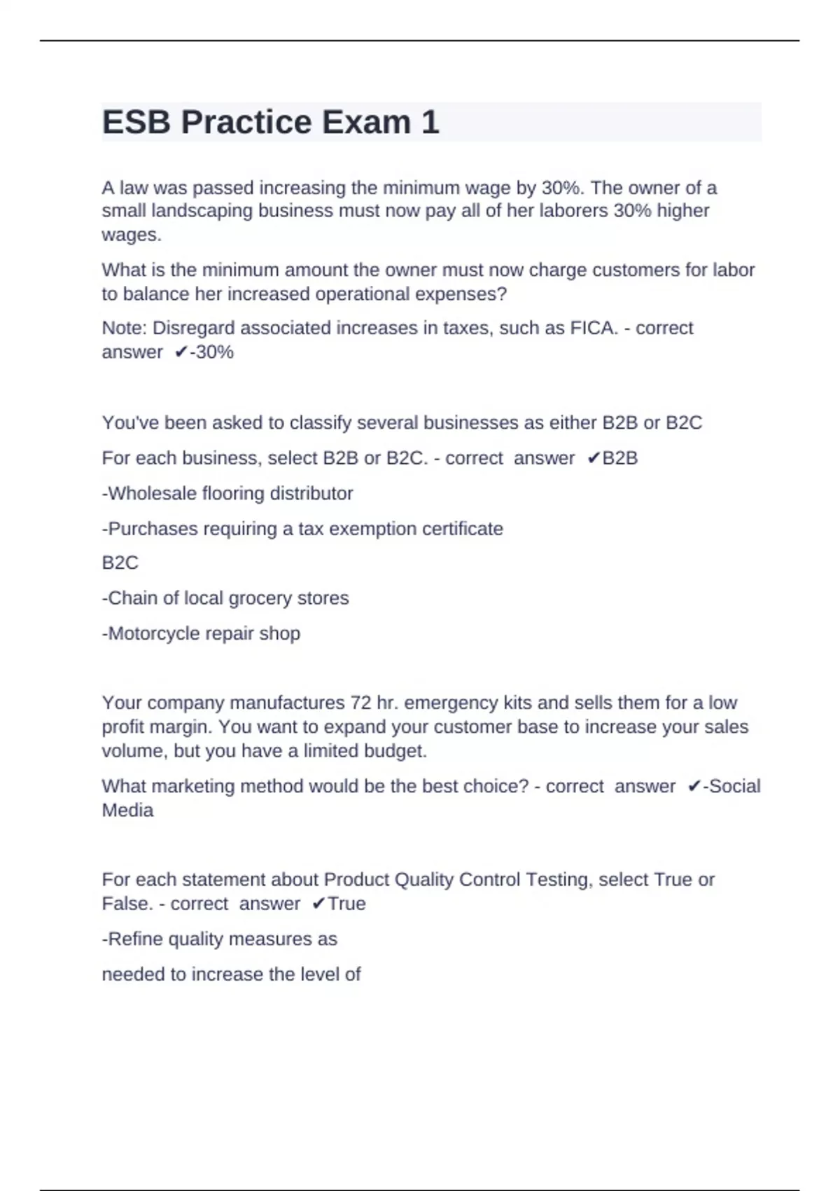 ESB Practice Exam 1 Question and answers correctly solved 2024 A law was passed increasing the minimum wage by 30%. The owner of a small landscaping business must now pay all of her laborers 30% higher wages. What is the minimum amount the owner must now charge customers for labor to balance her increased operational expenses? Note: Disregard associated increases in taxes, such as FICA. - correct answer -30% You've been asked to classify several businesses as either B2B or B2C For each business, select B2B or B2C. - correct answer B2B -Wholesale flooring distributor -Purchases requiring a tax exemption certificate B2C -Chain of local grocery stores -Motorcycle repair shop Your company