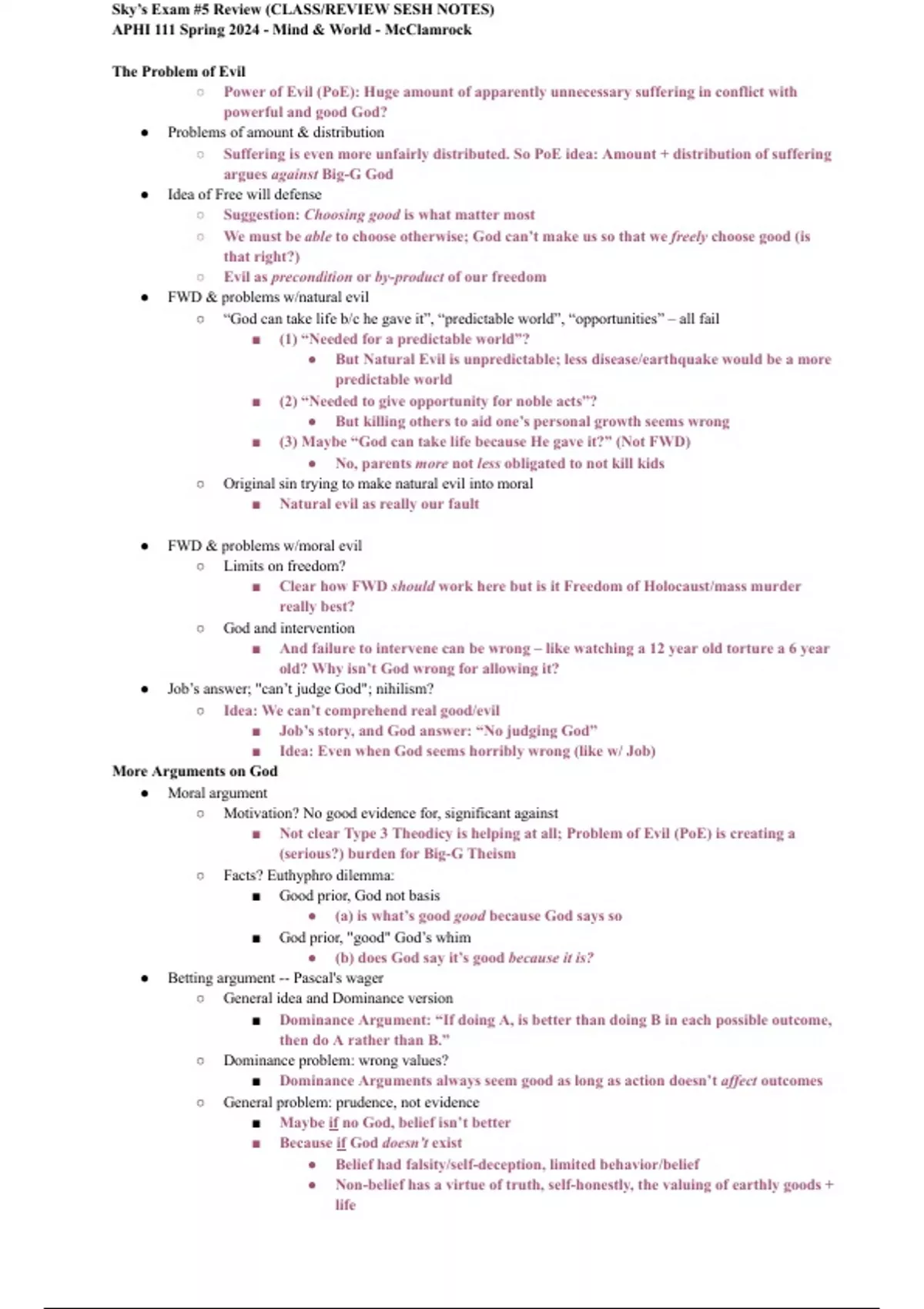 The document is a comprehensive review guide for an Advanced Philosophy (APHI 111) exam, covering key topics like the Problem of Evil, moral arguments, Pascal’s Wager, and related philosophical concepts. It explores the conflict between the existence of an all-good, all-powerful God and the presence of suffering, critiques the Free Will Defense and divine command theory, and analyzes the moral implications of belief in God versus atheism. The guide also reviews iClicker questions used in class, offering a summary and analysis of the material to help the student prepare for the exam with a deeper understanding of these complex issues.