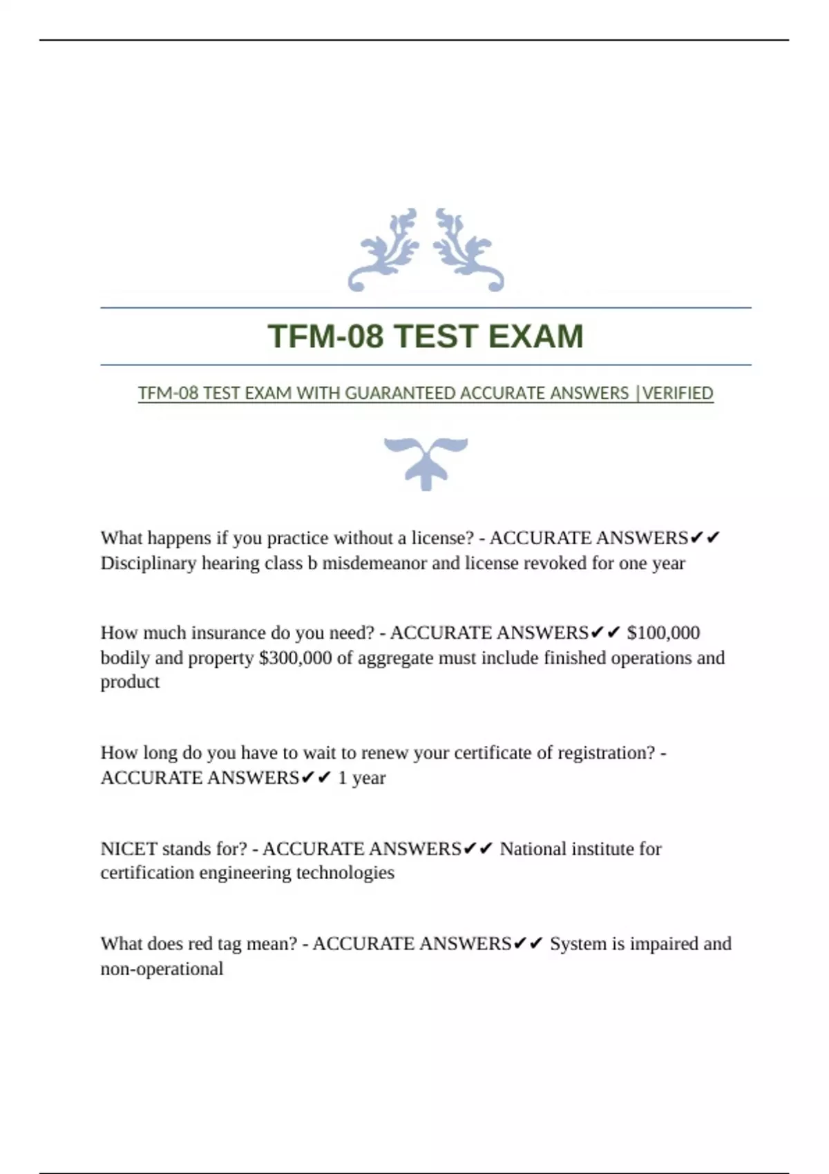 TFM-08 TEST EXAM WITH GUARANTEED ACCURATE ANSWERS |VERIFIED