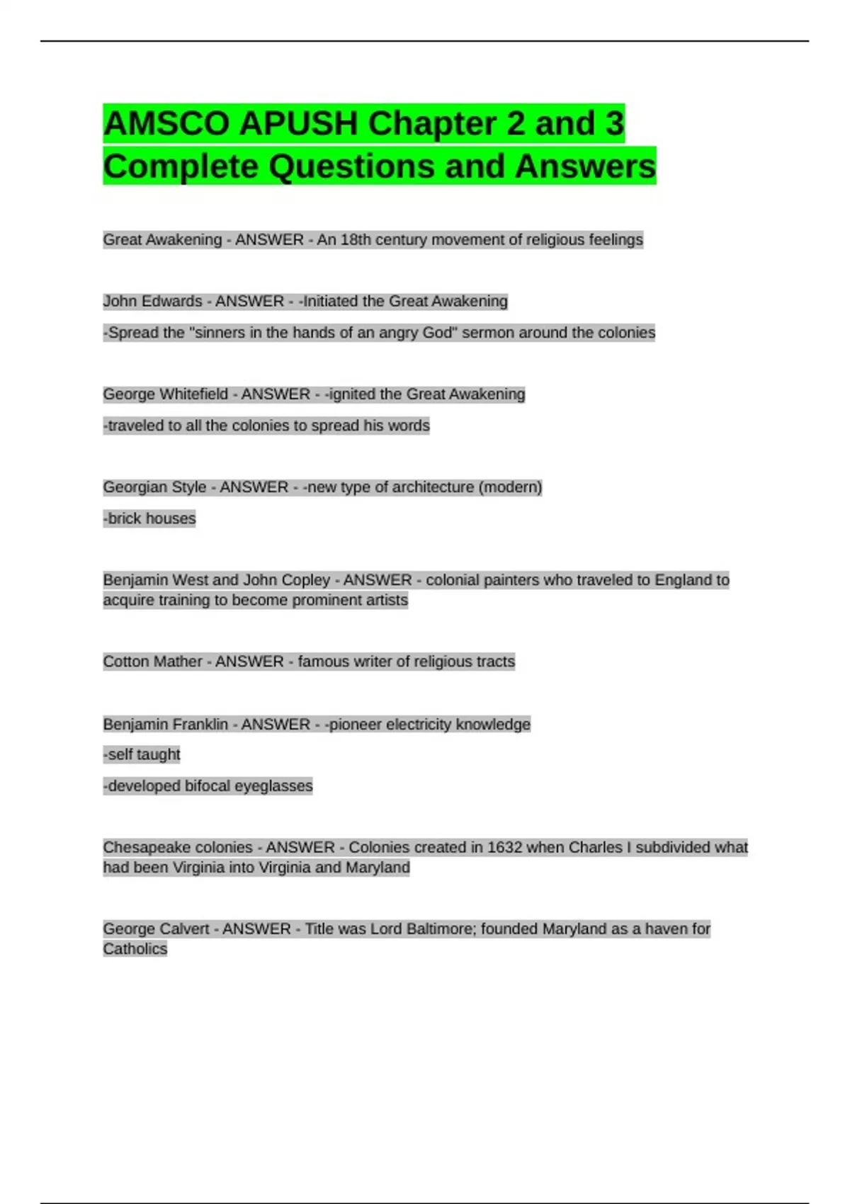 Great Awakening - ANSWER - An 18th century movement of religious feelings