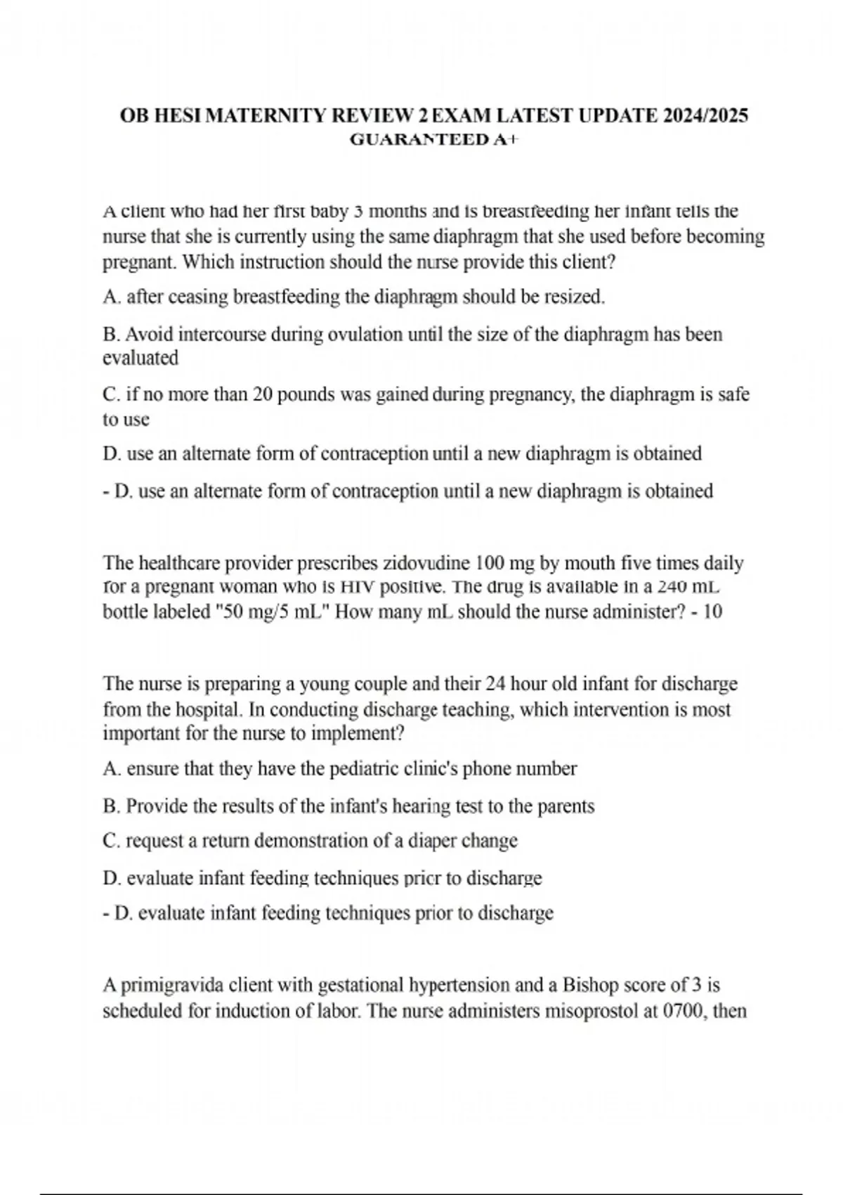 A client who had her first baby 3 months and is breastfeeding her infant tells the nurse that she is currently using the same diaphragm that she used before becoming pregnant. Which instruction should the nurse provide this client? A. after ceasing breastfeeding the diaphragm should be resized. B. Avoid intercourse during ovulation until the size of the diaphragm has been evaluated C. if no more than 20 pounds was gained during pregnancy, the diaphragm is safe to use D. use an alternate form of contraception until a new diaphragm is obtained - D. use an alternate form of contraception until a new diaphragm is obtained The healthcare provider prescribes zidovudine 100 mg by mouth five times daily for a pregnant woman who is HIV positive. The drug is available in a 240 mL bottle labeled "50 mg/5 mL" How many mL should the nurse administer? - 10 The nurse is preparing a young couple and their 24 hour old infant for discharge from the hospital. In conducting discharge teaching, which intervention is most important for the nurse to implement? A. ensure that they have the pediatric clinic's phone number B. Provide the results of the infant's hearing test to the parents C. request a return demonstration of a diaper change D. evaluate infant feeding techniques prior to discharge - D. evaluate infant feeding techniques prior to discharge A primigravida client with gestational hypertension and a Bishop score of 3 is scheduled for induction of labor. The nurse administers misoprostol at 0700, then observes regular contractions with cervical changes at 0900. Which action should the nurse take? A. administer misoprostol every 2 hours B. ambulate the client after administration of misoprostol C. start oxytocin infusion immediately D. begin oxytocin 4 hours after misoprostol is given - D. begin oxytocin 4 hours after misoprostol is given A multigravida client in labor is receiving oxytocin 4 mu/min to help promote an effective contraction pattern. The available solution is LR 1,000 mL with oxytocin 20 units. The nurse should program the infusion pump to deliver how many mL/hour? (enter numeric value only.) - 12 The nurse is caring for a client whose fetus died in utero at 32 weeks gestation. After the fetus is delivered vaginally, the nurse implements routine fetal demise protocol and identification procedures. Which action is most important for the nurse to take? A. explain reasons consent for an infant autopsy is needed B. Encourage the mother to hold and spend time with her baby C. determine if the mother desires a visit from her clergy D. create a memory box of baby's footprints and photographs - B. Encourage the mother to hold and spend time with her baby