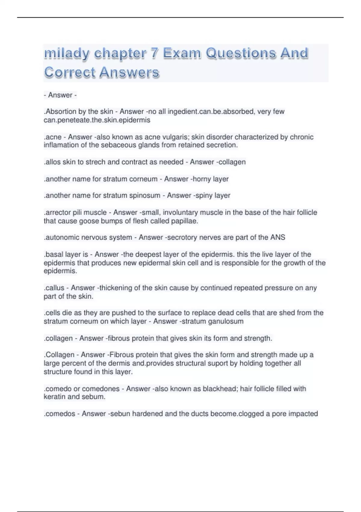 .Collagen - Answer -Fibrous protein that gives the skin form and strength made up a