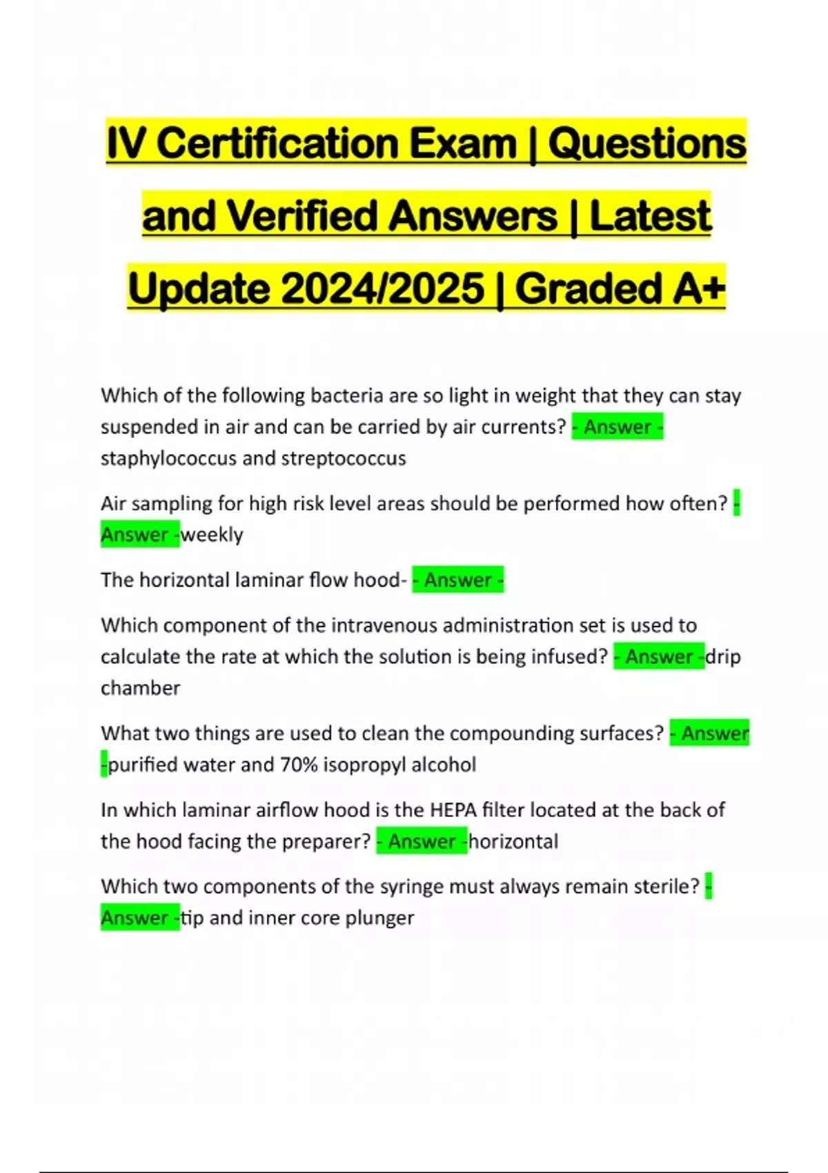 IV Certification Exam | Questions and Verified Answers | Latest Update 2024/2025 | Graded A+ Which of the following bacteria are so light in weight that they can stay suspended in air and can be carried by air currents? - Answer - staphylococcus and streptococcus Air sampling for high risk level areas should be performed how often? - Answer -weekly The horizontal laminar flow hood- - Answer - Which component of the intravenous administration set is used to calculate the rate at which the solution is being infused? - Answer -drip chamber What two things are used to clean the compounding surfaces? - Answer -purified water and 70% isopropyl alcohol In which laminar airflow hood is the HEPA filter located at the back of the hood facing the preparer? - Answer -horizontal Which two components of the syringe must always remain sterile? - Answer -tip and inner core plungerWhen working in a HORIZONTAL laminar airflow, all manipulations should be performed how many inches withing the hood? - Answer -6 When working in a VERTICAL laminar airflow hood, all manipulations should be carried out how many inches above the work surface? - Answer -3