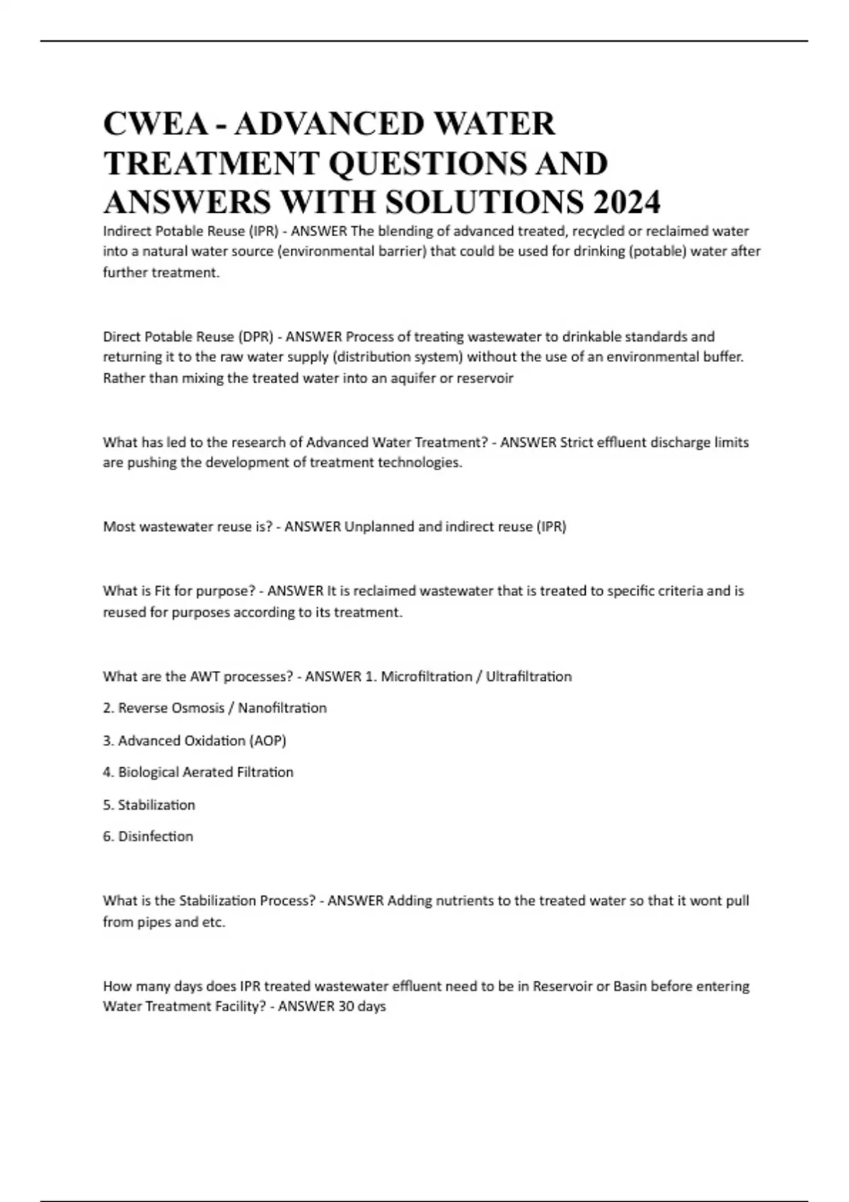 Indirect Potable Reuse (IPR) - ANSWER The blending of advanced treated, recycled or reclaimed water