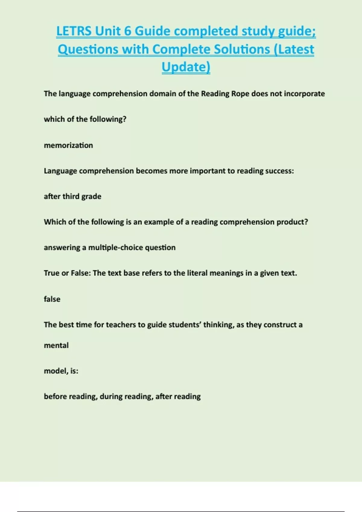 LETRS Unit 6 Guide completed study guide; Questions with Complete Solutions (Latest Update) The language comprehension domain of the Reading Rope does not incorporate which of the following? memorization Language comprehension becomes more important to reading success: after third grade Which of the following is an example of a reading comprehension product? answering a multiple-choice question True or False: The text base refers to the literal meanings in a given text. false