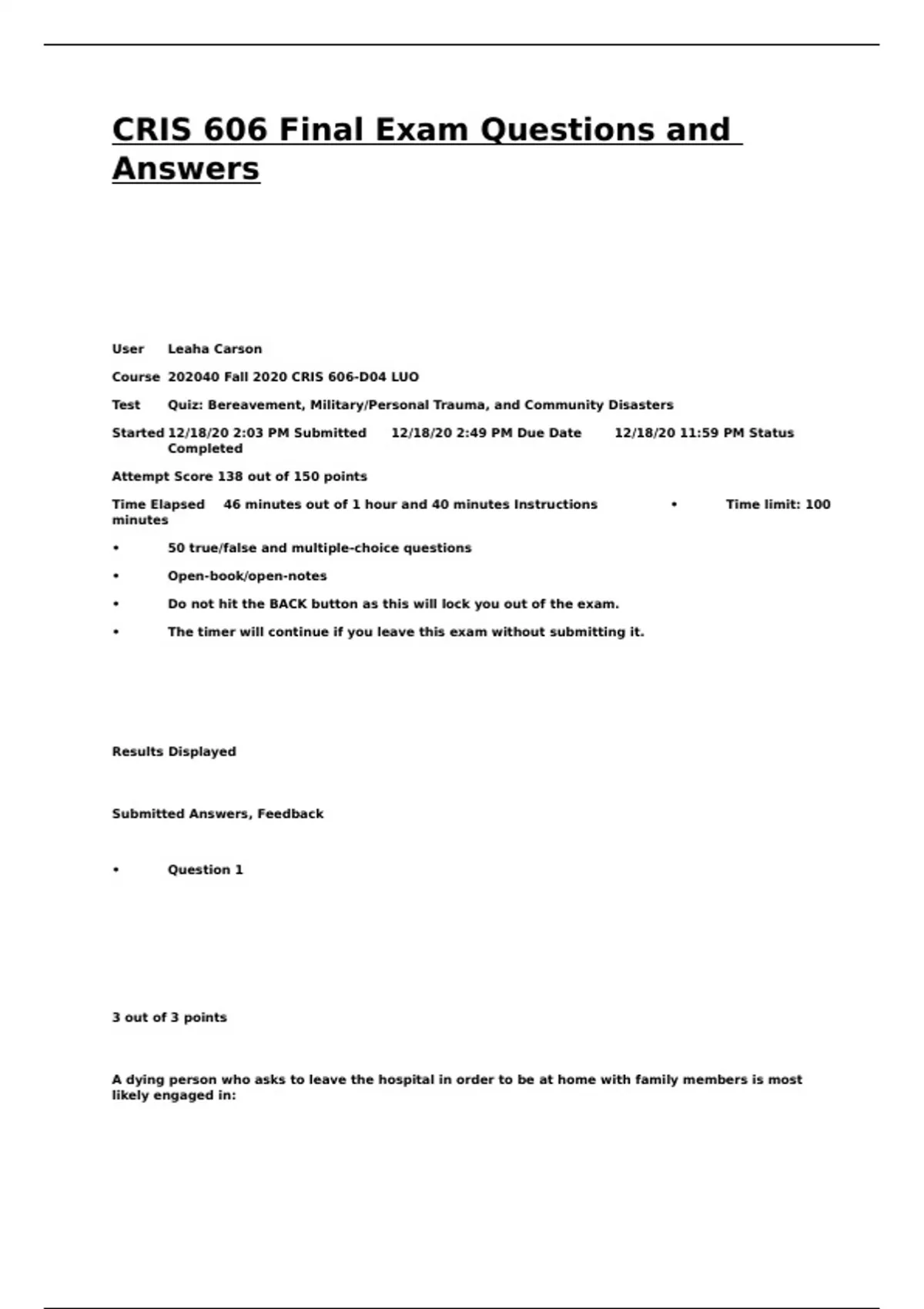 Review Test Submission: Quiz: Bereavement, Military/Personal Trauma, and Community Disasters User Leaha Carson Course Fall 2020 CRIS 606-D04 LUO Test Quiz: Bereavement, Military/Personal Trauma, and Community Disasters Started 12/18/20 2:03 PM Submitted 12/18/20 2:49 PM Due Date 12/18/20 11:59 PM Status Completed Attempt Score 138 out of 150 points Time Elapsed 46 minutes out of 1 hour and 40 minutes Instructions  Time limit: 100 minutes  50 true/false and multiple-choice questions  Open-book/open-notes  Do not hit the BACK button as this will lock you out of the exam.  The timer will continue if you leave this exam without submitting it. Results Displayed Submitted Answers, Feedback  Question 1 3 out of 3 points A dying person who asks to leave the hospital in order to be at home with family members is most likely engaged in: Selected Answer: e. Performing a social task  Question 2 0 out of 3 points A dying person: Selected Answer: c. Will want to maintain close relationships with all of those who have been important in his or her life  Question 3 3 out of 3 points “Spiritual” tasks _________. Selected Answer: e. include a search for meaningfulness  Question 4 0 out of 3 points The premature death of the spirit in a body that still remains physically alive is said to involve