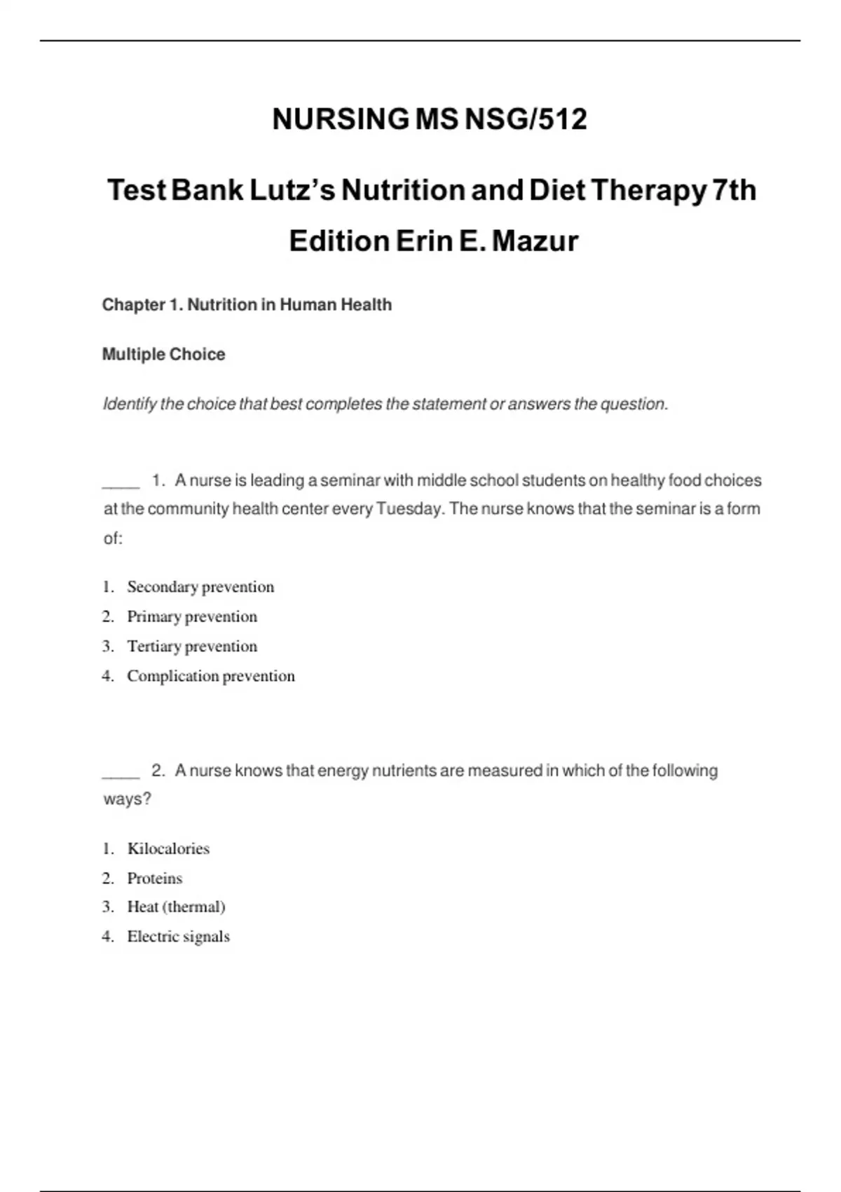 Test Bank Lutz’s Nutrition and Diet Therapy 7th Edition Erin E. Mazur