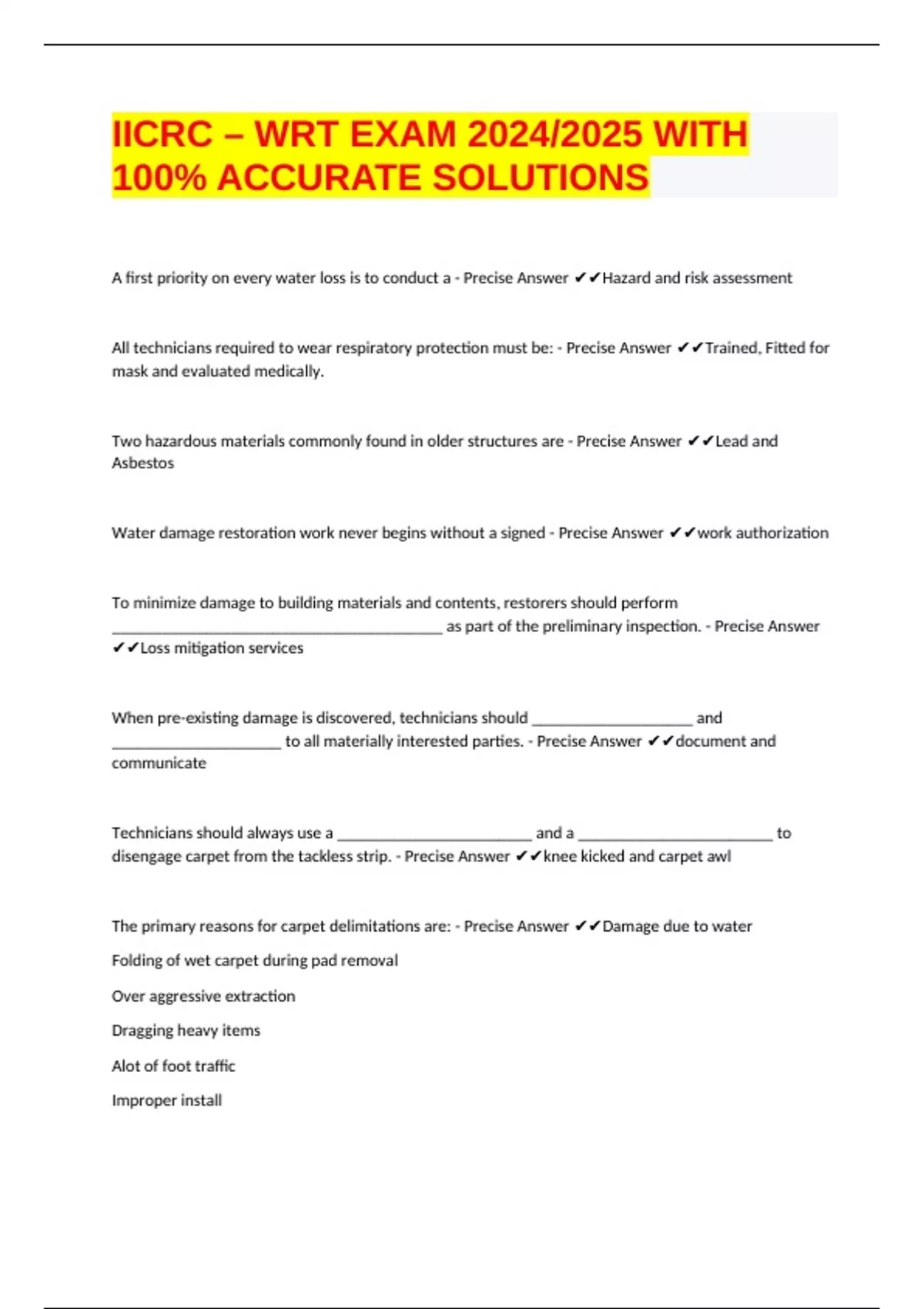 Water damage restoration work never begins without a signed - Precise Answer ✔✔work authorization