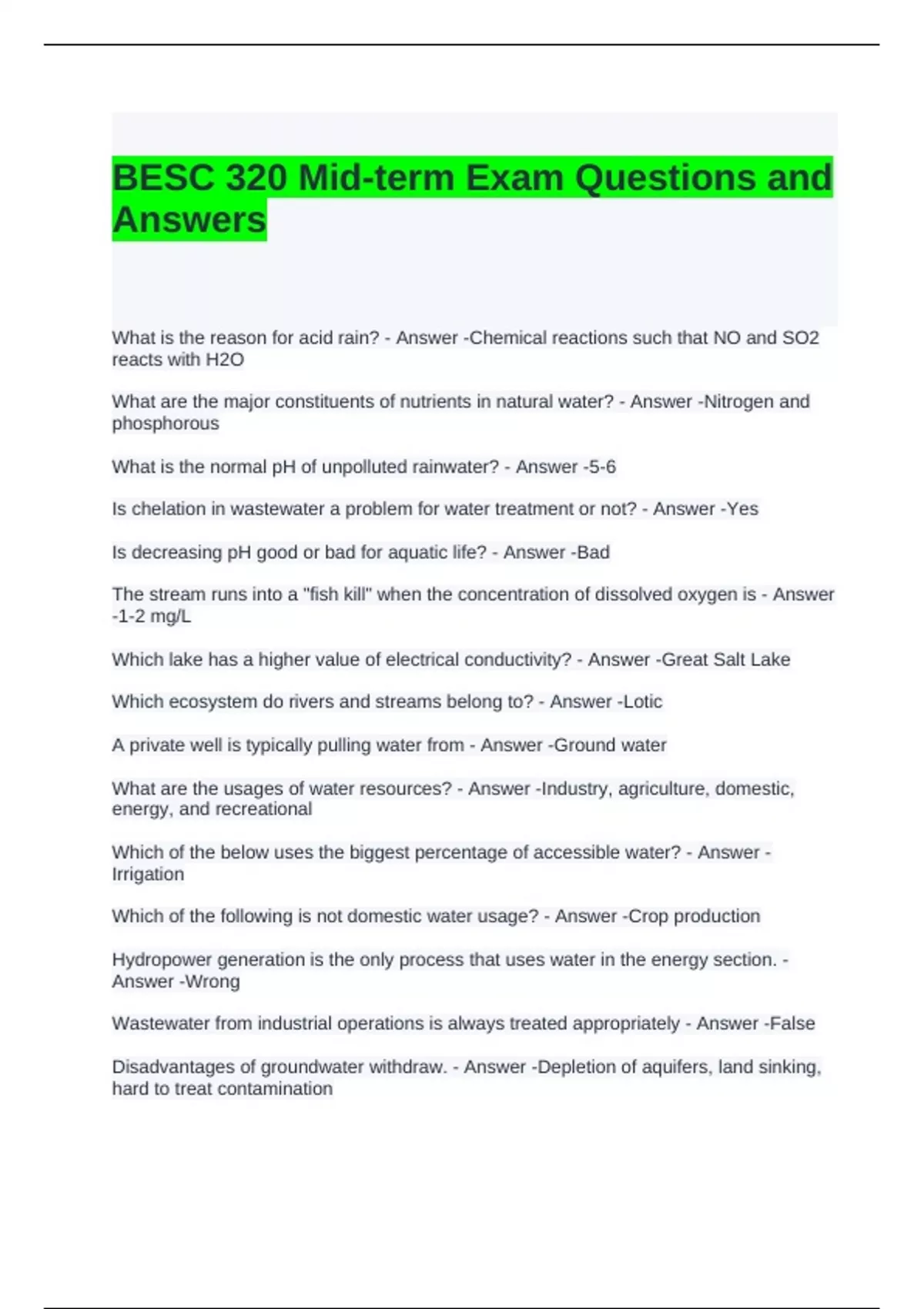 BESC 320 Mid-term Exam Questions and