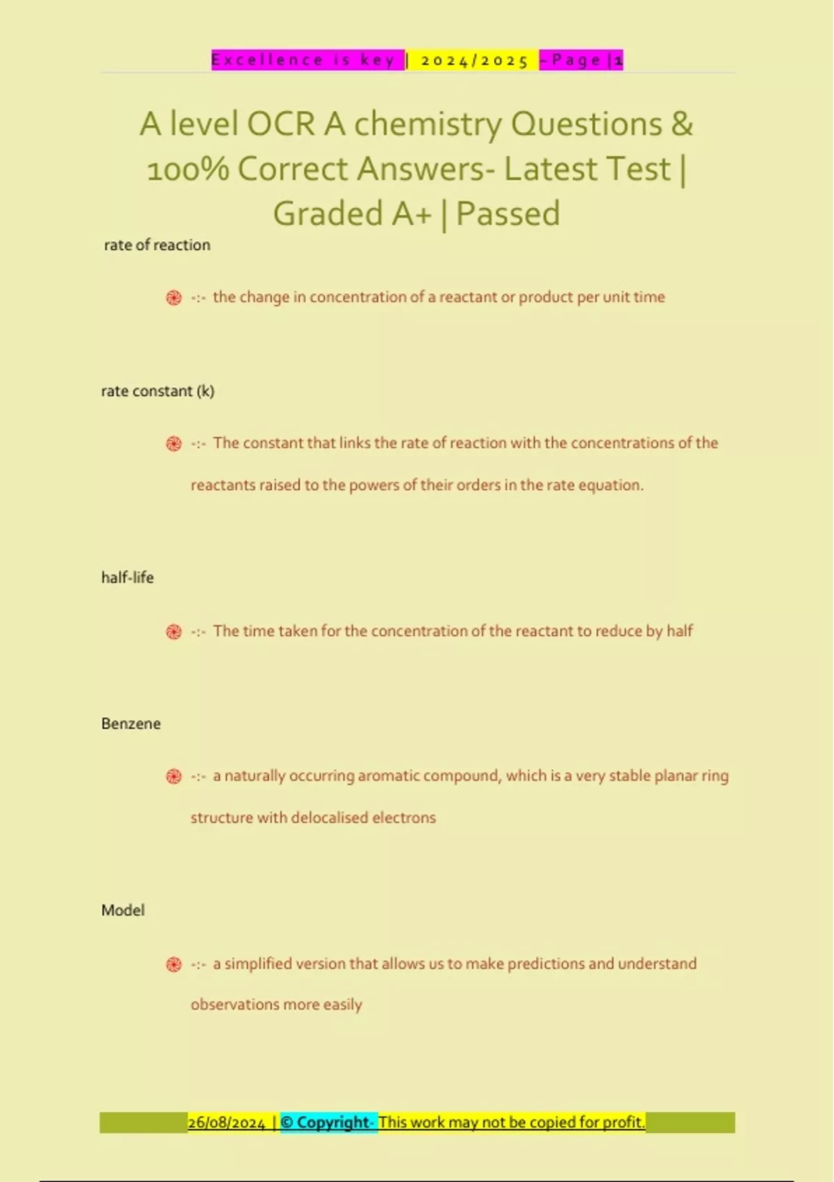 rate of reaction ֎ -:- the change in concentration of a reactant or product per unit time rate constant (k) ֎ -:- The constant that links the rate of reaction with the concentrations of the reactants raised to the powers of their orders in the rate equation. half-life ֎ -:- The time taken for the concentration of the reactant to reduce by half Benzene ֎ -:- a naturally occurring aromatic compound, which is a very stable planar ring structure with delocalised electrons Model ֎ -:- a simplified version that allows us to make predictions and understand observations more easily E x c e l l e n c e i s k e y | 2 0 2 4 / 2 0 2 5 ~ P a g e | 2 26/08/2024 | © Copyright- This work may not be copied for profit. Lattice enthalpy ֎ -:- The enthalpy change that accompanies the formation of one mole of an ionic lattice from its gaseous ions under standard conditions e.g. K+(g) + Cl-(g) -> KCl(s) - enthalpy change standard enthalpy change of formation ֎ -:- The enthalpy change that takes place when one mole of a compound is formed from its constituent elements in their standard states under standard condition