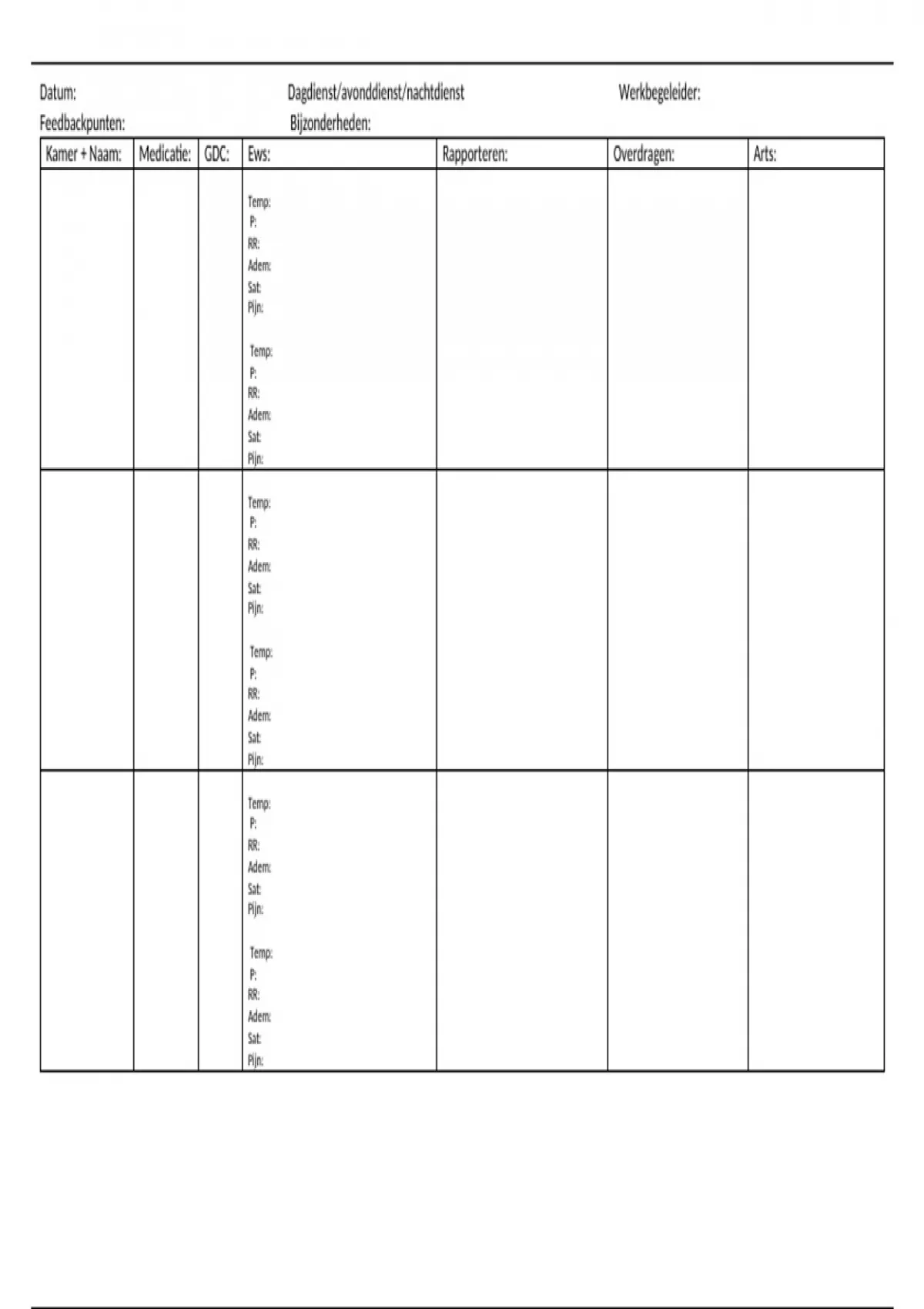 Kamer + Naam: Medicatie: GDC: Ews: Rapporteren: Overdragen: Arts: