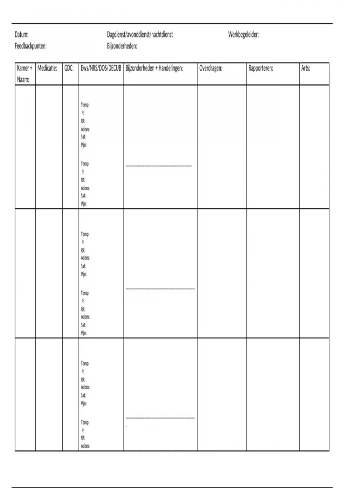 Kamer + Medicatie: GDC: Ews/NRS/DOS/DECUB Bijzonderheden + Handelingen: Overdragen: Rapporteren: Arts: