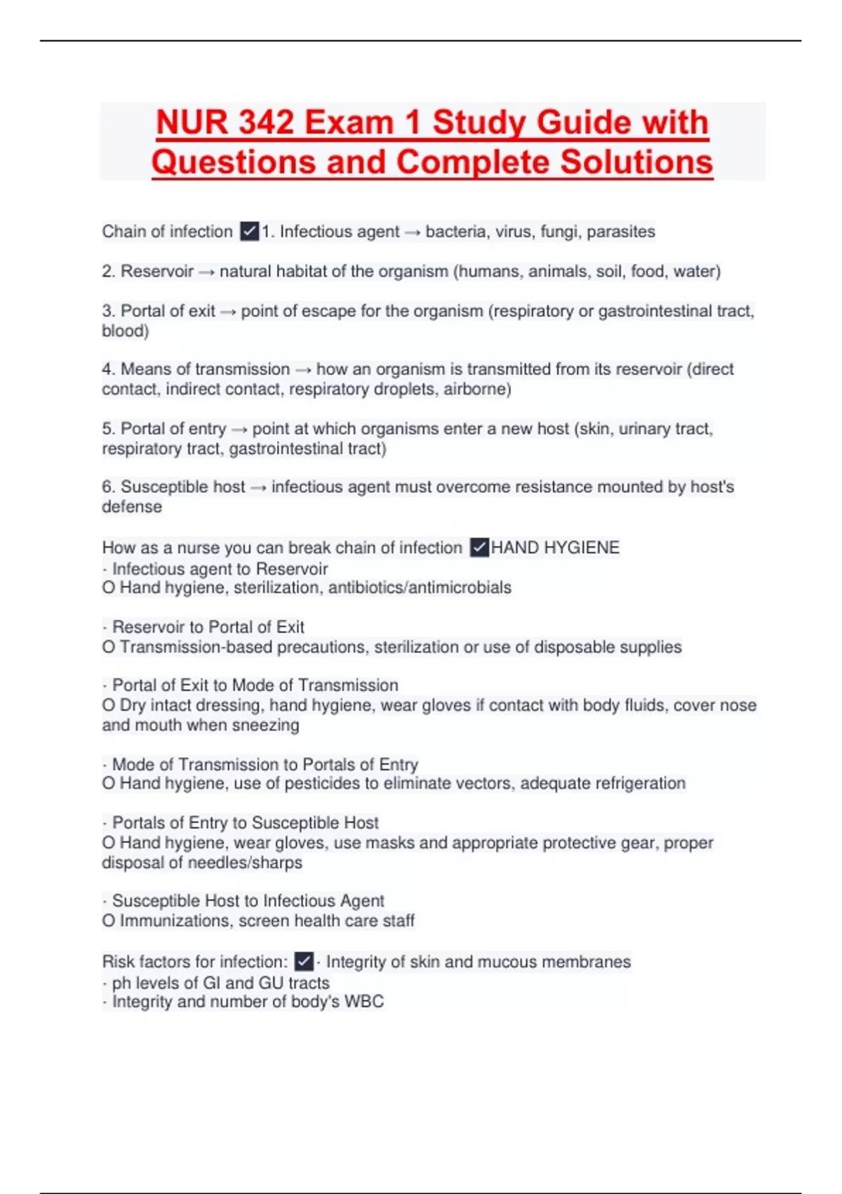 Chain of infection 1. Infectious agent → bacteria, virus, fungi, parasites 2. Reservoir → natural habitat of the organism (humans, animals, soil, food, water) 3. Portal of exit → point of escape for the organism (respiratory or gastrointestinal tract, blood) 4. Means of transmission → how an organism is transmitted from its reservoir (direct contact, indirect contact, respiratory droplets, airborne) 5. Portal of entry → point at which organisms enter a new host (skin, urinary tract, respiratory tract, gastrointestinal tract) 6. Susceptible host → infectious agent must overcome resistance mounted by host's defense How as a nurse you can break chain of infection HAND HYGIENE · Infectious agent to Reservoir O Hand hygiene, sterilization, antibiotics/antimicrobials · Reservoir to Portal of Exit O Transmission-based precautions, sterilization or use of disposable supplies · Portal of Exit to Mode of Transmission O Dry intact dressing, hand hygiene, wear gloves if contact with body fluids, cover nose and mouth when sneezing · Mode of Transmission to Portals of Entry O Hand hygiene, use of pesticides to eliminate vectors, adequate refrigeration · Portals of Entry to Susceptible Host O Hand hygiene, wear gloves, use masks and appropriate protective gear, proper disposal of needles/sharps · Susceptible Host to Infectious Agent O Immunizations, screen health care staff Risk factors for infection: · Integrity of skin and mucous membranes · ph levels of GI and GU tracts · Integrity and number of body's WBC