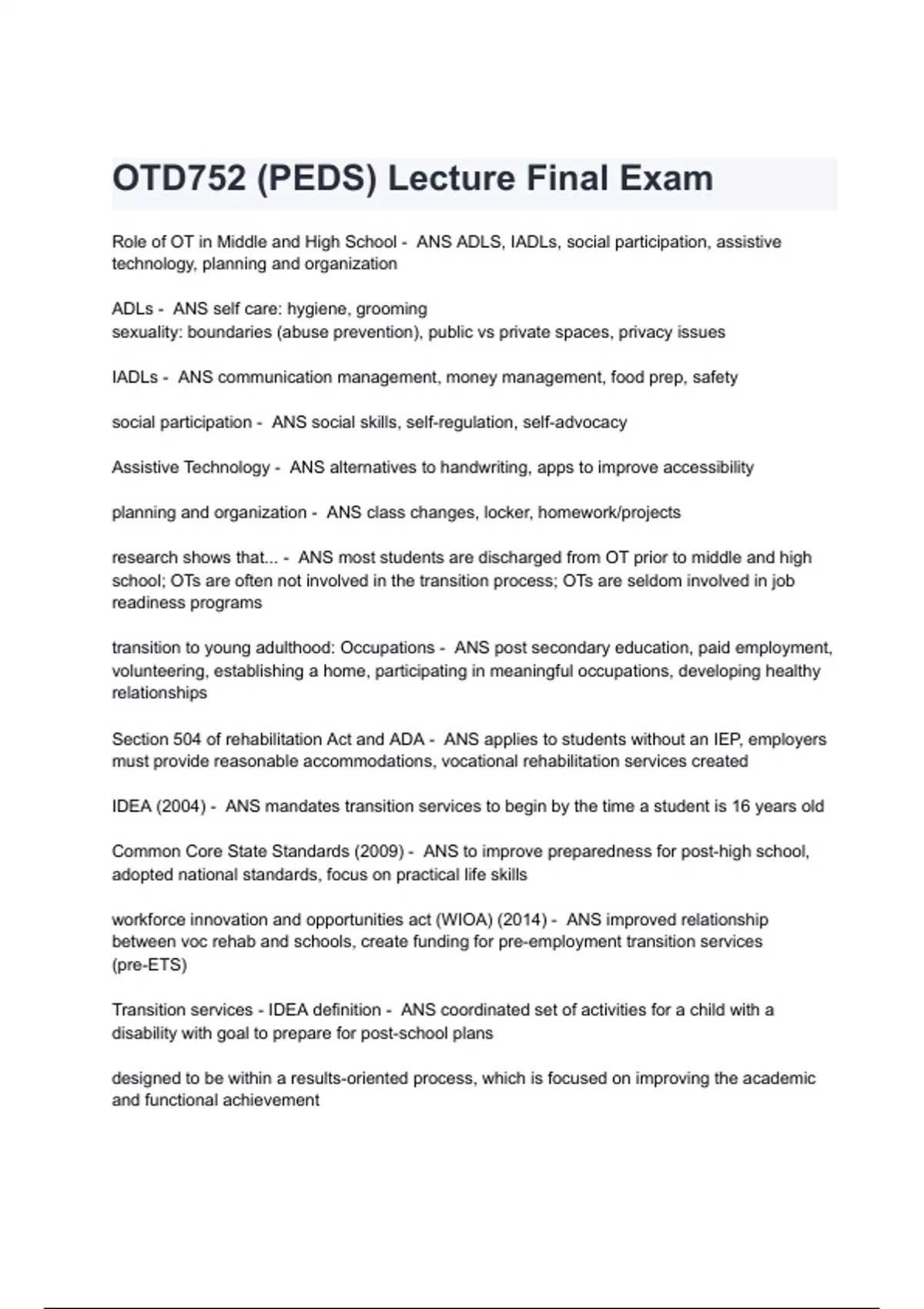 OTD752 (PEDS) Lecture Final Exam