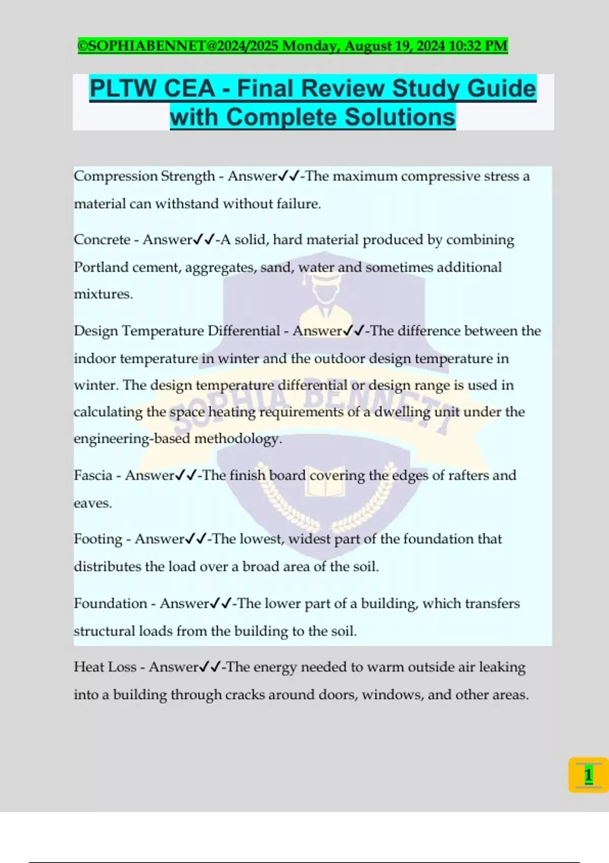 PLTW CEA - Final Review Study Guide with Complete Solutions Compression Strength - Answer️️ -The maximum compressive stress a material can withstand without failure. Concrete - Answer️️ -A solid, hard material produced by combining Portland cement, aggregates, sand, water and sometimes additional mixtures. Design Temperature Differential - Answer️️ -The difference between the indoor temperature in winter and the outdoor design temperature in winter. The design temperature differential or design range is used in calculating the space heating requirements of a dwelling unit under the engineering-based methodology. Fascia - Answer️️ -The finish board covering the edges of rafters and eaves. Footing - Answer️️ -The lowest, widest part of the foundation that distributes the load over a broad area of the soil. Foundation - Answer️️ -The lower part of a building, which transfers structural loads from the building to the soil. Heat Loss - Answer️️ -The energy needed to warm outside air leaking into a building through cracks around doors, windows, and other areas. ©SOPHIABENNET@2024/2025 Monday, August 19, 2024 10:32 PM 2 Radiant Heat - Answer️️ -Energy radiated or transmitted as rays or waves, in the form of particles. Rafter - Answer️️ -Member of a roof structural frame that supports the sheathing and other roof loads. Rebar - Answer️️ -Steel bar used to reinforce concrete. R-Value - Answer️️ -The numerical value used to indicate the resistance to the flow of heat. Sole Plate - Answer️️ -The plate placed at the bottom of a wall. Square (Quantity of Shingles) - Answer️️ -In roofing, 100 square feet of roofing material. Tensile Strength - Answer️️ -The maximum stress a material subjected to a stretching load can withstand without tearing. Thermal Conduction - Answer️️ -The process of heat transfer through a solid by transmitting kinetic energy from one molecule to the next. Thermal Convection - Answer️️ -Heat transmission by the circulation of a liquid or a heated gas or air. Transmission Load - Answer️️ -Heat loss/gain resulting from the conduction of heat through the building envelope. U-Factor - Answer️️ -A measure of the heat transmission through a building part (as a wall or window) or a given thickness of a material (as insulation) with lower numbers indicating better insulating properties. ©SOPHIABENNET@2024/2025 Monday, August 19, 2024 10:32 PM 3 Aesthetics - Answer️️ -the quality of an objects that deals with art, beauty, and taste Arch - Answer️️ -a curved structure for spanning an opening, designed to support a vertical load primarily by axial compression Architect - Answer️️ -an individual trained in the art and science of designing and constructing buildings Balance - Answer️️ -the pleasing or harmonious arrangement or proportion of parts or elements in a design or composition Bearing Walls - Answer️️ -solid walls that provide support for each other and for the roof of a structure Civil Engineering - Answer️️ -an engineer trained in