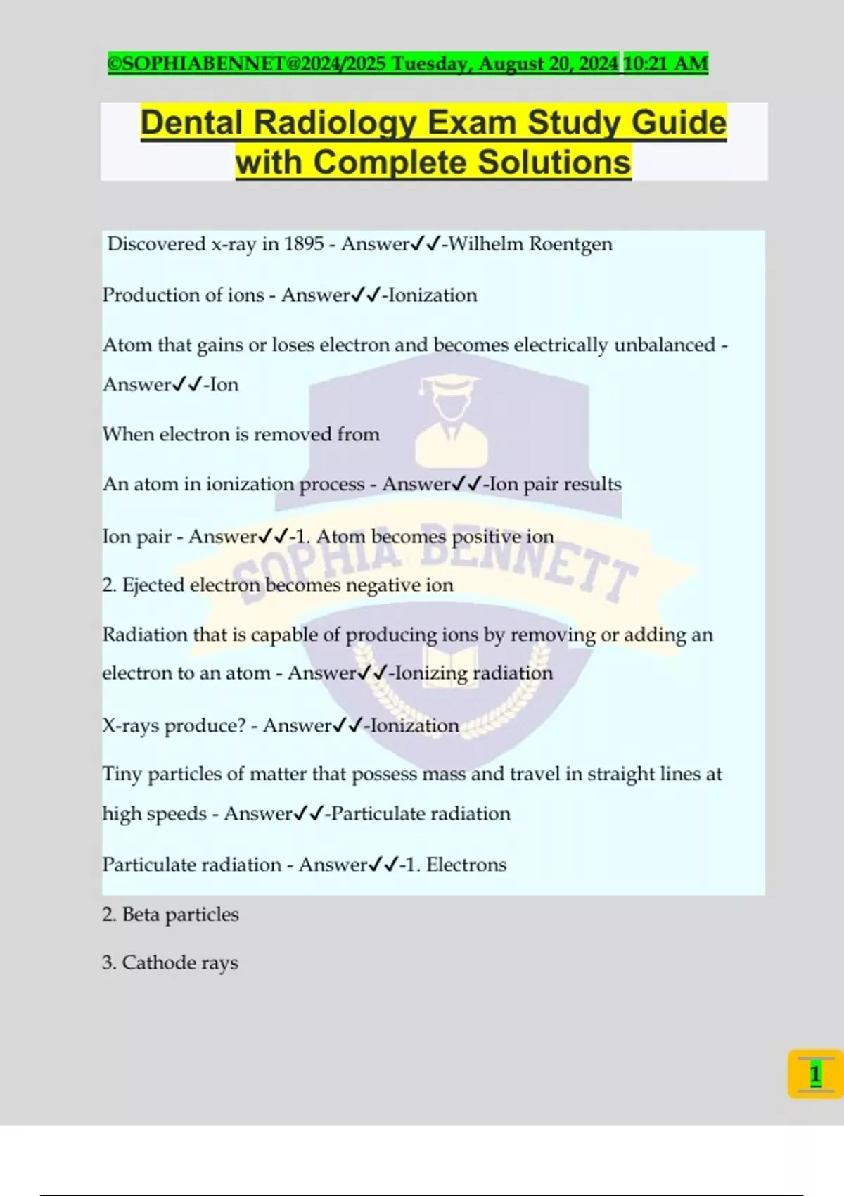 Dental Radiology Exam Study Guide with Complete Solutions Discovered x-ray in 1895 - Answer️️ -Wilhelm Roentgen Production of ions - Answer️️ -Ionization Atom that gains or loses electron and becomes electrically unbalanced - Answer️️ -Ion When electron is removed from An atom in ionization process - Answer️️ -Ion pair results Ion pair - Answer️️ -1. Atom becomes positive ion 2. Ejected electron becomes negative ion Radiation that is capable of producing ions by removing or adding an electron to an atom - Answer️️ -Ionizing radiation X-rays produce? - Answer️️ -Ionization Tiny particles of matter that possess mass and travel in straight lines at high speeds - Answer️️ -Particulate radiation Particulate radiation - Answer️️ -1. Electrons 2. Beta particles 3. Cathode rays ©SOPHIABENNET@2024/2025 Tuesday, August 20, 2024 10:21 AM 2 4. Alpha particles 5. Neutrons 6. Protons Propagation of wave-like energy (without mass, without particles) through space or matter - Answer️️ -Electromagnetic radiation Electromagnetic radiation - Answer️️ -1. Cosmic rays 2. X-rays 3. Microwaves, radio waves 4. Gamma rays 5. Ultraviolet rays 6. Visible light Speed of wave - Answer️️ -Velocity Distance bt crest of one wave to crest of next wave - Answer️️ - Wavelength Number of wavelengths that pass a point in a certain amount of time - Answer️️ -Frequency Electromagnetic ionizing radiation of very short wavelength resulting from the bombardment of tungsten by highly accelerated electrons in a vacuum - Answer️️ -X-ray X-Ray tube contains - Answer️️ -1. Protective leaded glass housing ©SOPHIABENNET@2024/2025 Tuesday, August 20, 2024 10:21 AM 3 2. Cathode 3. Anode Protective leaded glass housing - Answer️️ -1. Tube enclosure with all air removed, shielding prevents radiation leakage 2. High vacuum glass tube surrounded by refined oil with high insulating powers, oil helps to absorb excess heat Made of tungsten filament and molybdenum cup - Answer️️ -Cathode Charge of cathode - Answer️️ -Negative Heated to give off cloud of electrons - Answer️️ -Filament -thermionic emission Focuses electrons toward the anode - Answer️️ -Cup Supplies electrons necessary to generate x-rays - Answer️️ -Cathode Made of a copper arm and focal spot - Answer️️ -Anode Charge of anode - Answer️️ -Positive Focal spot is made of - Answer️️ -Tungsten target Action of anode - Answer️️ -Converts bombarding electrons into x-Ray photons What happens when electrons strike tungsten target - Answer️️ -Energy of motion is converted to x-Ray energy and heat ©SOPHIABENNET@2024/2025 Tuesday, August 20, 2024 10:21 AM 4 How much of energy is lost as heat - Answer️️ -99% Quality of C-Ray beam - Answer️️ -kVp Quality refers to - Answer️️ -Penetrating power of beam KVp regulates - Answer️️ -Speed of electron traveling from cathode to anode Higher kVp means - Answer️️ -Faster electrons Higher kVp=harder x-rays= - Answer️️ -Short wa