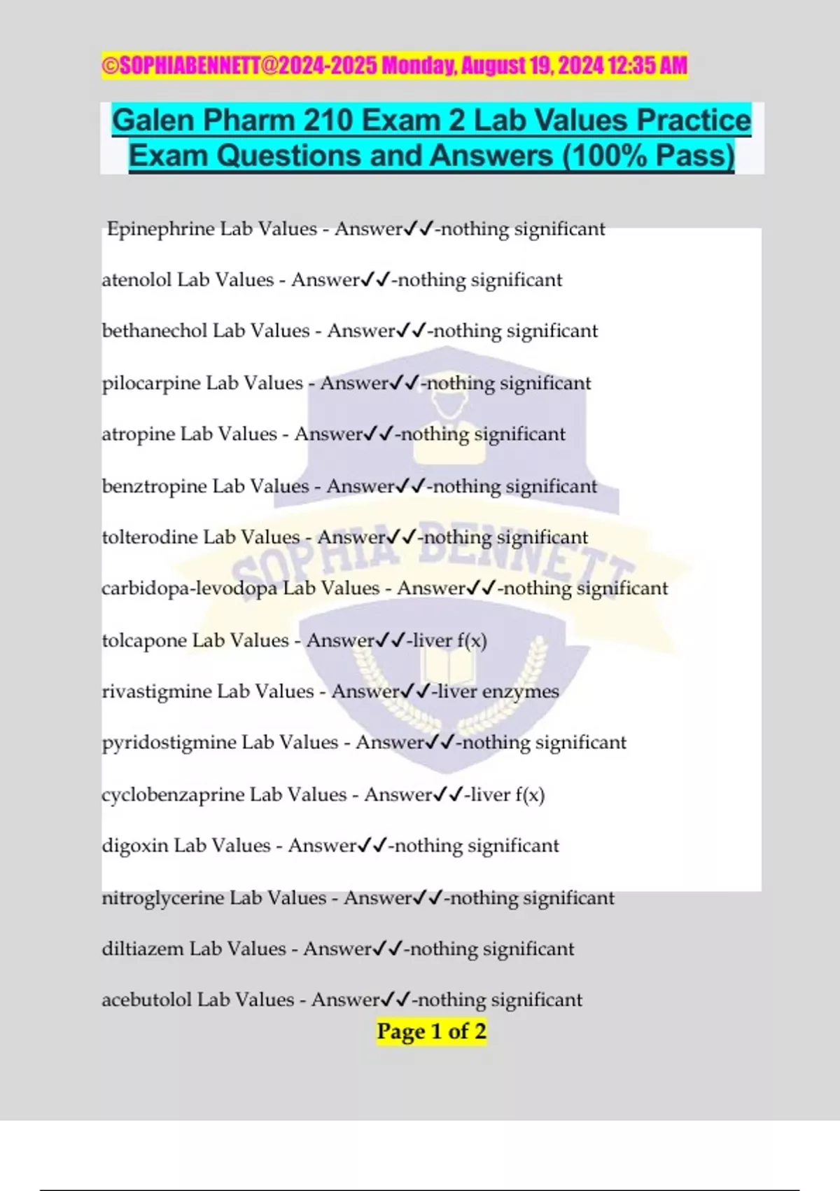 Galen Pharm 210 Exam 2 Lab Values Practice Exam Questions and Answers (100% Pass)