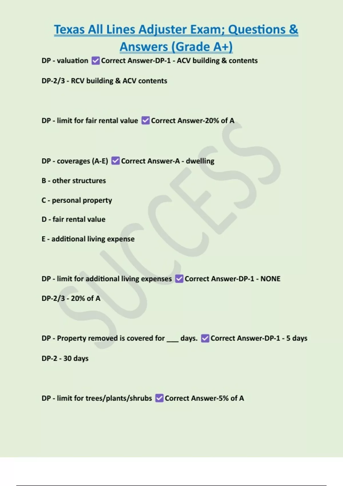 Texas All Lines Adjuster Exam; Questions & Answers (Grade A+) DP - valuation Correct Answer-DP-1 - ACV building & contents DP-2/3 - RCV building & ACV contents DP - limit for fair rental value Correct Answer-20% of A DP - coverages (A-E) Correct Answer-A - dwelling B - other structures C - personal property D - fair rental value E - additional living expense