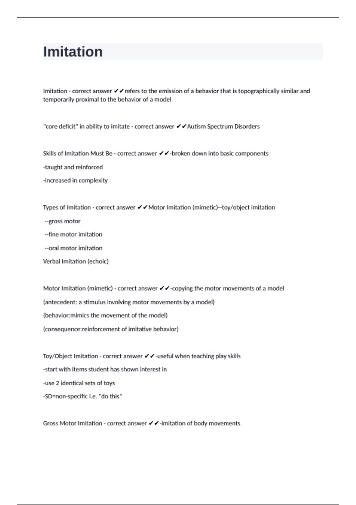 Types of Imitation - correct answer ✔✔Motor Imitation (mimetic)--toy/object imitation