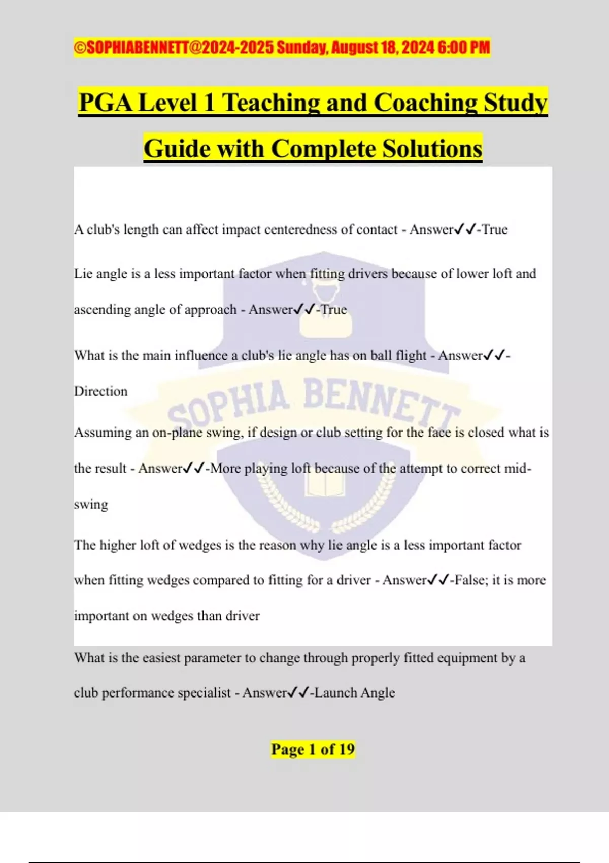 PGA Level 1 Teaching and Coaching Study Guide with Complete Solutions A club's length can affect impact centeredness of contact - Answer️️ -True Lie angle is a less important factor when fitting drivers because of lower loft and ascending angle of approach - Answer️️ -True What is the main influence a club's lie angle has on ball flight - Answer️️ - Direction Assuming an on-plane swing, if design or club setting for the face is closed what is the result - Answer️️ -More playing loft because of the attempt to correct mid- swing The higher loft of wedges is the reason why lie angle is a less important factor when fitting wedges compared to fitting for a driver - Answer️️ -False; it is more important on wedges than driver What is the easiest parameter to change through properly fitted equipment by a club performance specialist - Answer️️ -Launch Angle ©SOPHIABENNETT@ Sunday, August 18, 2024 6:00 PM Page 2 of 19 Tempo is a measure of the number of times a shaft oscillates in a unit of time - Answer️️ -False The shaft's kick point is where the bend in the shaft is the greatest - Answer️️ - True Measurement of the energy lost or retained when the clubhead and ball collide is called - Answer️️ -Coefficient of restitution What is the consequence of playing a club with an improper lie angle - Answer️️ -Problems with ball direction Swing inconsistency is a probable cause of playing with improperly sized grips - Answer️️ -True Launch parameters in driver fitting of high launch angle and low spin rate results in the golfer seeking - Answer️️ -Maximum distance The clubhead must be at maximum speed to achieve maximum transfer of energy to the golf ball - Answer️️ -False A club that is shortened will play more upright - Answer️️ -False What effect does adding bounce angle have on a golf club - Answer️️ -Increases loft ©SOPHIABENNETT@ Sunday, August 18, 2024 6:00 PM Page 3 of 19 PTR is - Answer️️ -Ball speed/clubhead speed Given a square clubface and straight path, what is most influenced by the ball's spin rate - Answer️️ -Trajectory What can teachers achieve by clearly stating expected attitudes and behaviors - Answer️️ -Enhance student relationships A teacher can learn strategies to weave humor into a lesson - Answer️️ -True What is the characteristic represented by the willingness to adapt to their communication style to fit student needs - Answer️️ -Flexibility How teachers should represent consistency in their student interactions - Answer️️ -Respond in the same manner in similar situations Verbal expression is the best way to demonstrate attentivene