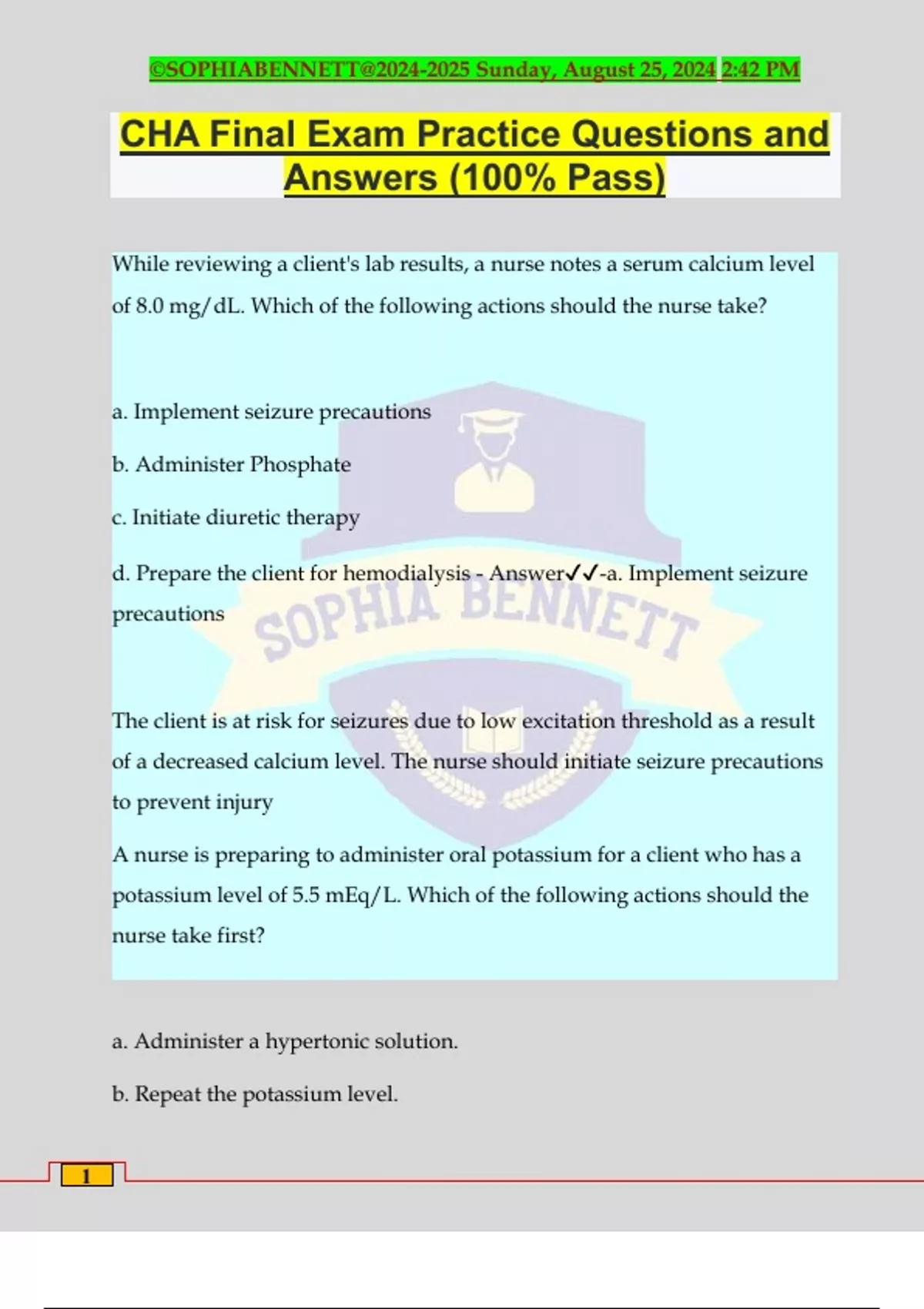 d. Prepare the client for hemodialysis - Answer✔️✔️-a. Implement seizure