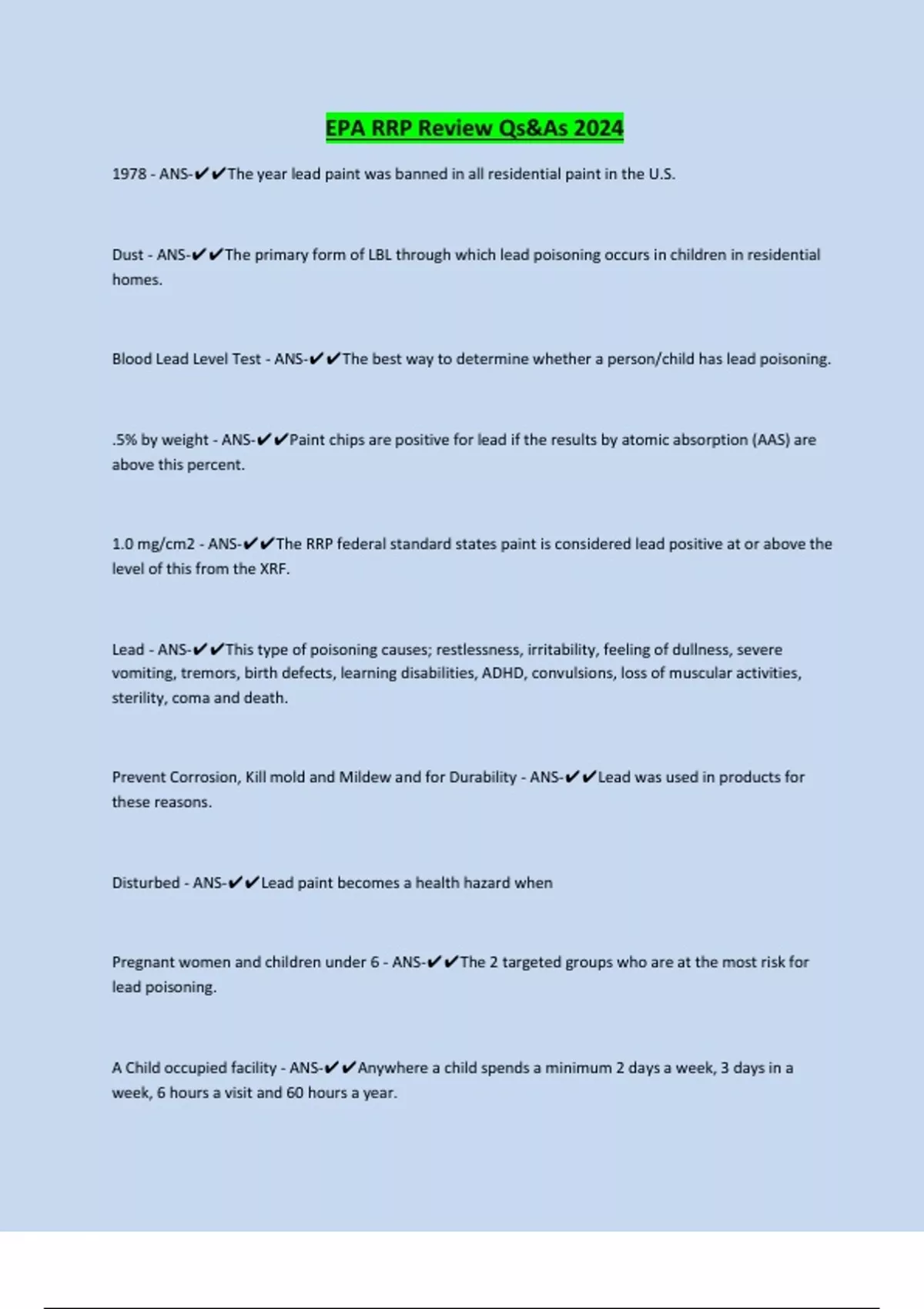Blood Lead Level Test - ANS-✔✔The best way to determine whether a person/child has lead poisoning.