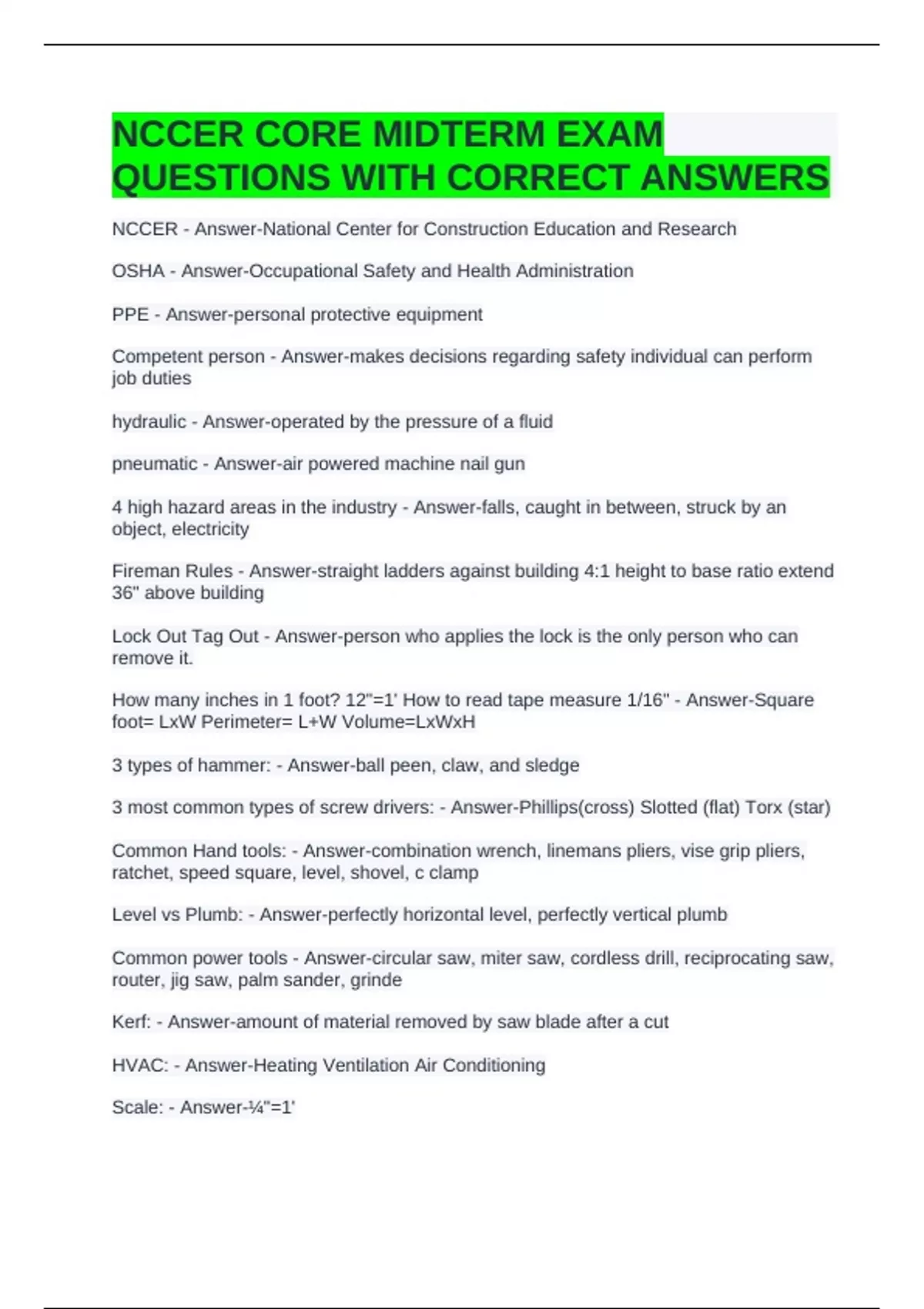 NCCER CORE MIDTERM EXAM QUESTIONS WITH CORRECT ANSWERS