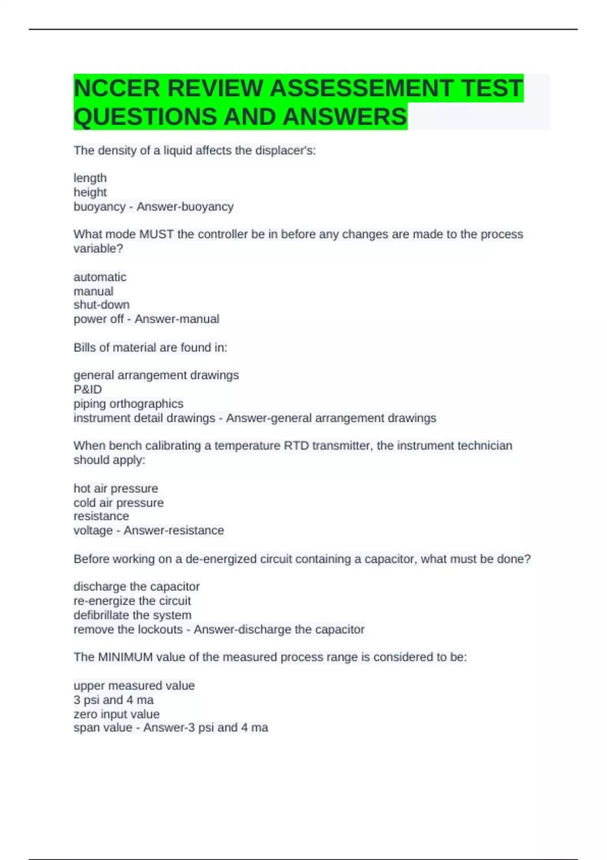 NCCER REVIEW ASSESSEMENT TEST QUESTIONS AND ANSWERS