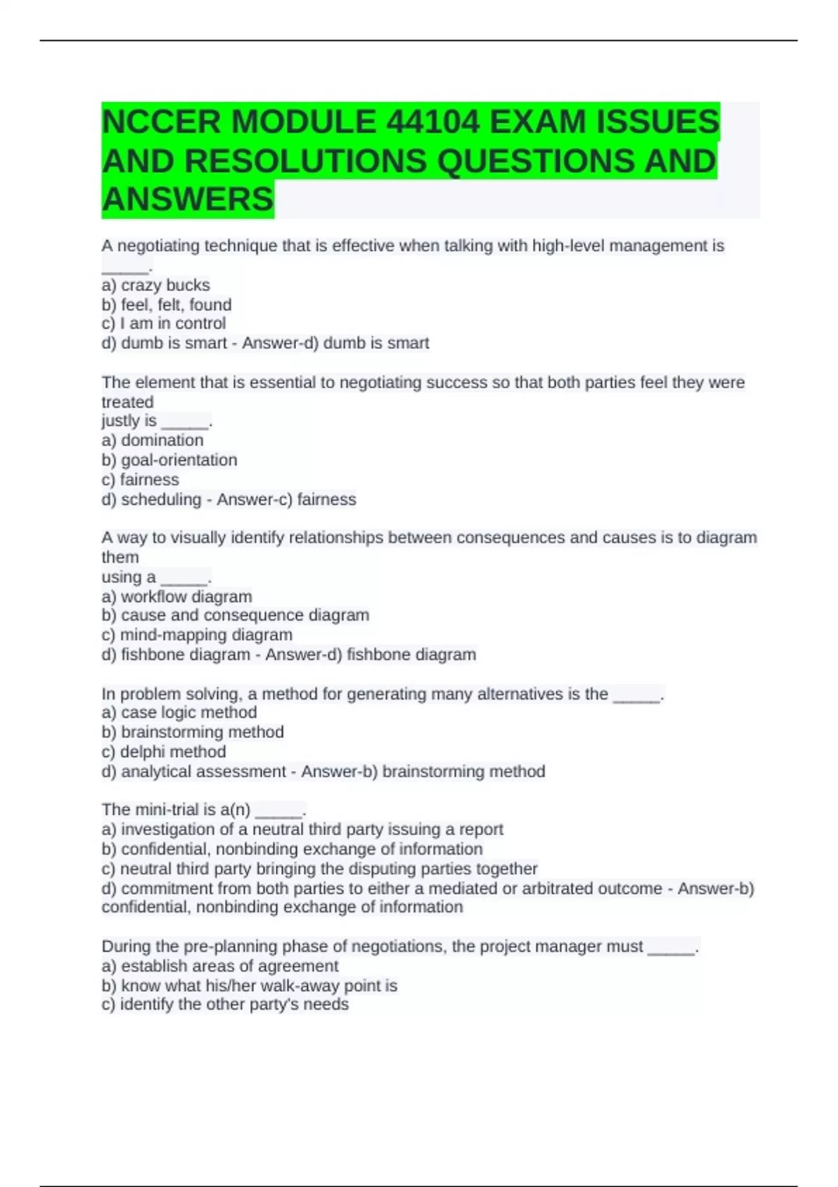 NCCER MODULE 44104 EXAM ISSUES AND RESOLUTIONS QUESTIONS AND ANSWERS