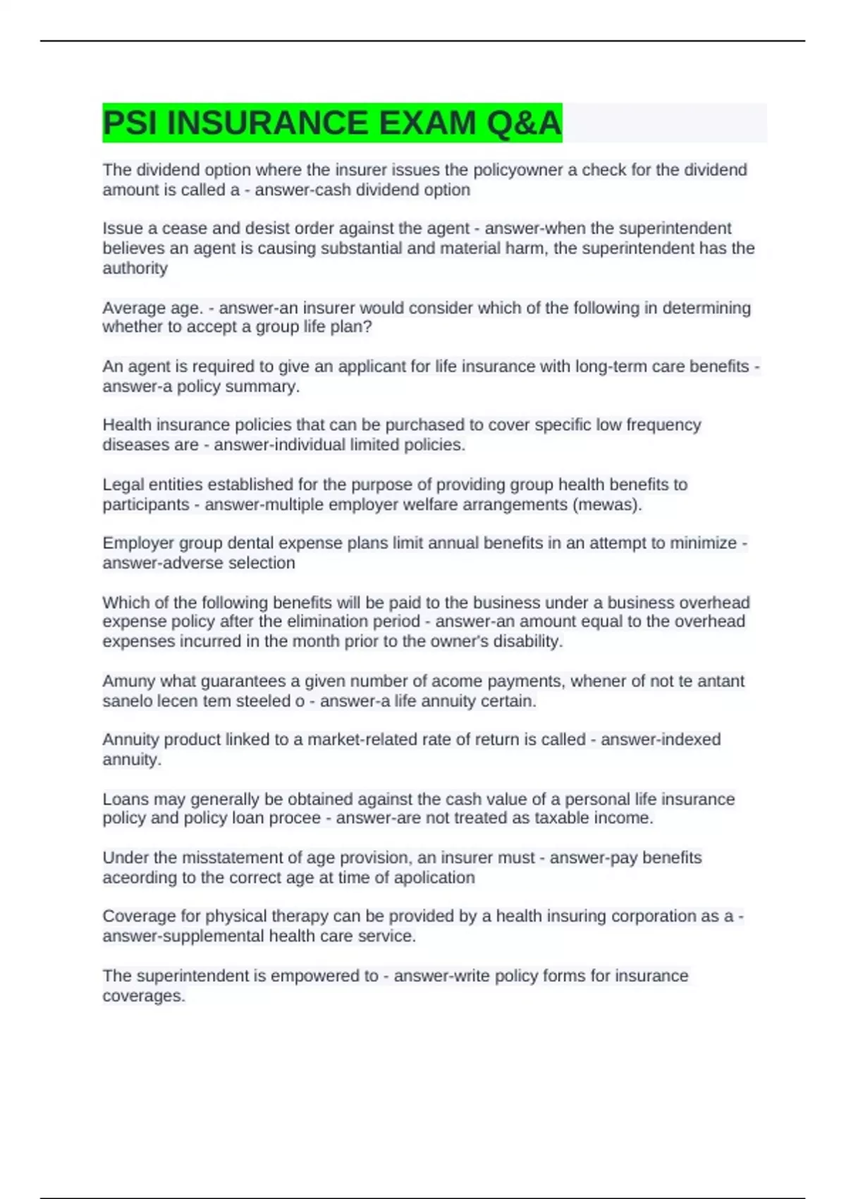 PSI INSURANCE EXAM Q&A