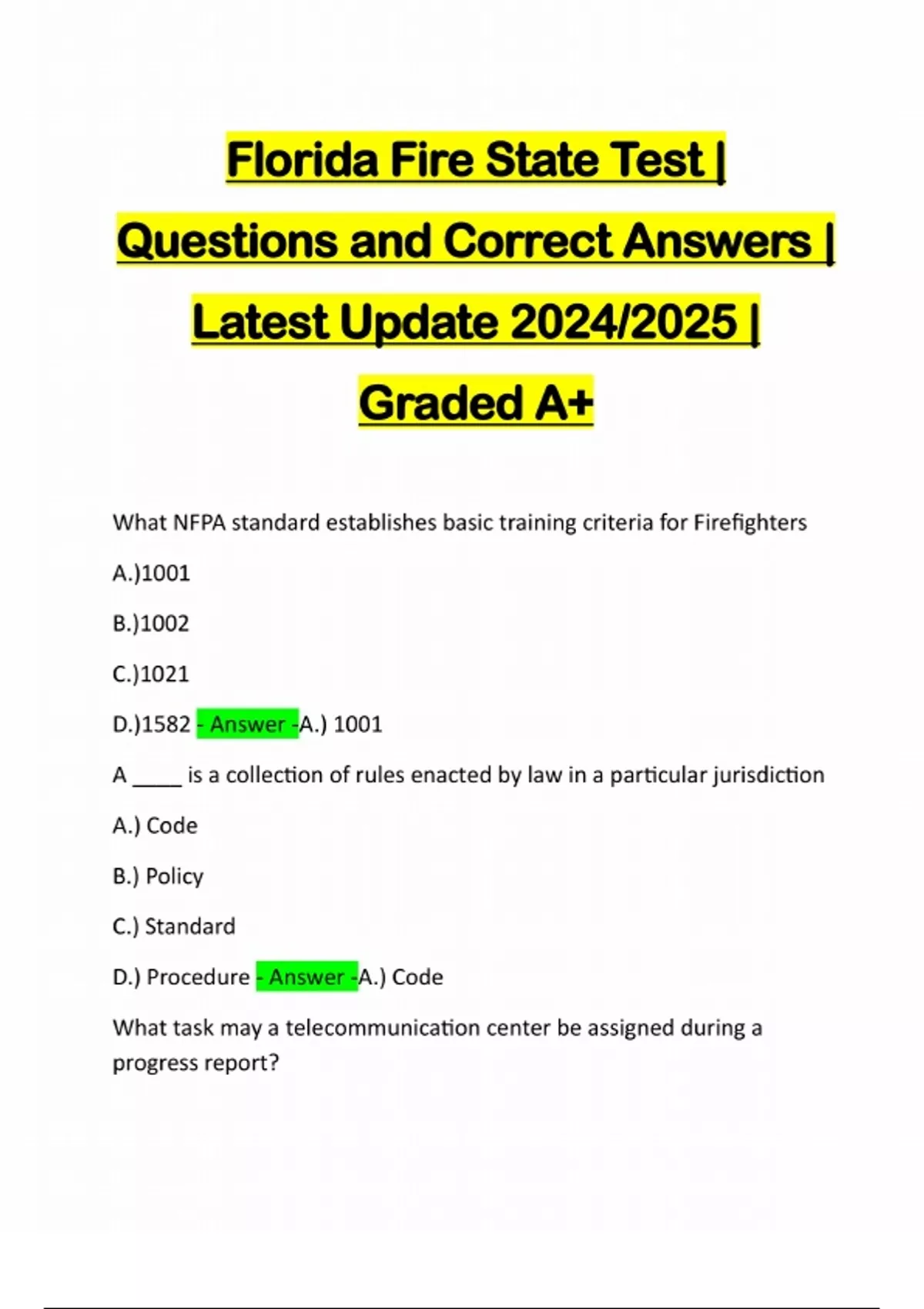 Florida Fire State Test | Questions and Correct Answers | Latest Update 2024/2025 | Graded A+ What NFPA standard establishes basic training criteria for Firefighters A.)1001 B.)1002 C.)1021 D.)1582 - Answer -A.) 1001 A ____ is a collection of rules enacted by law in a particular jurisdiction A.) Code B.) Policy C.) Standard D.) Procedure - Answer -A.) Code What task may a telecommunication center be assigned during a progress report?A.)Requesting multiple or special alarms B.)Providing periodic time transmissions C.)Warning personnel of impending hazards on scene D.)Giving command in the absence of command staff - Answer - B.)Providing periodic time transmissions. Which of the following must be considered when deciding the size of a collapse zone? a.)local adopted building codes b.)number of personnel on-scene c.)type of building construction and safest location for personnel d.)number of personnel on-scene and type of building construc