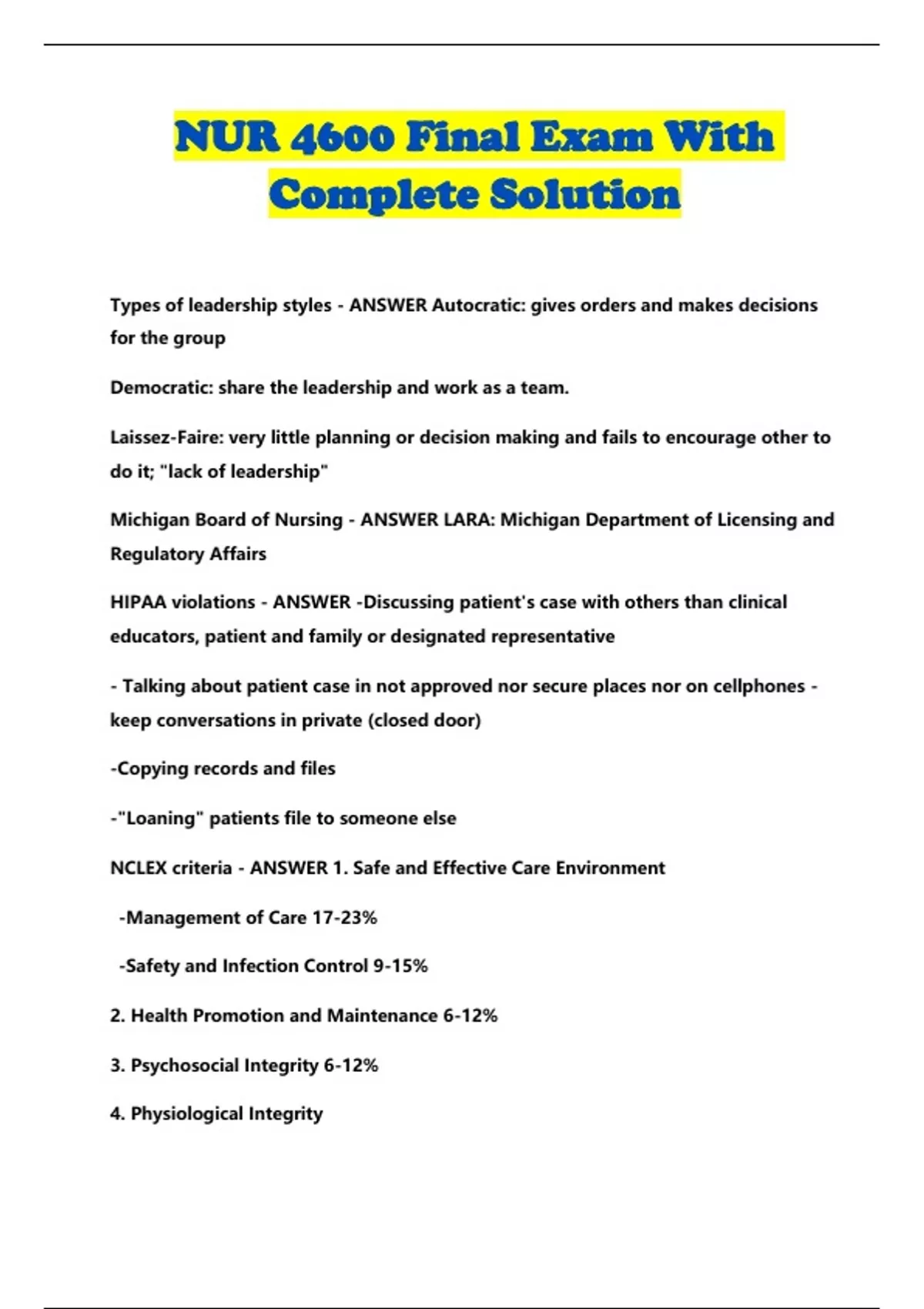 NUR 4600 Final Exam With Complete Solution