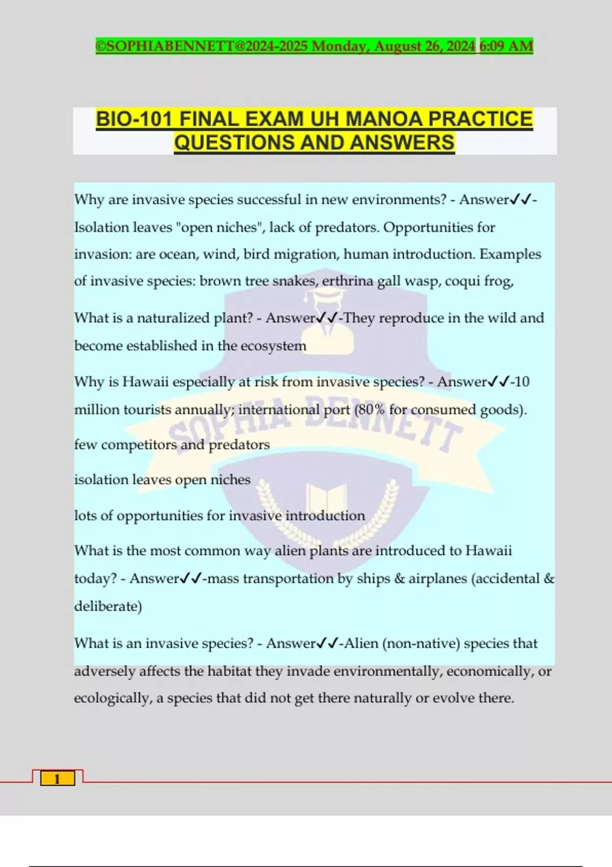BIO-101 FINAL EXAM UH MANOA PRACTICE