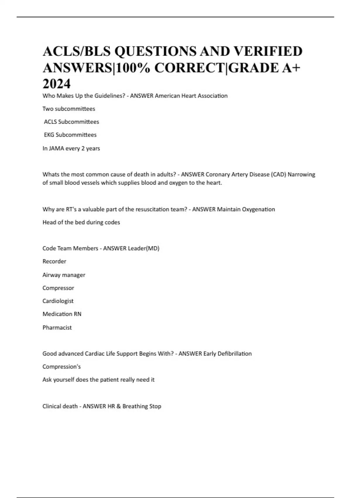 ACLS/BLS QUESTIONS AND VERIFIED ANSWERS|100% CORRECT|GRADE A+ 2024